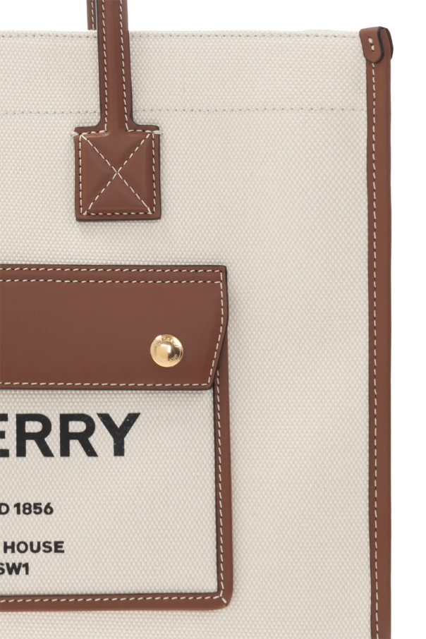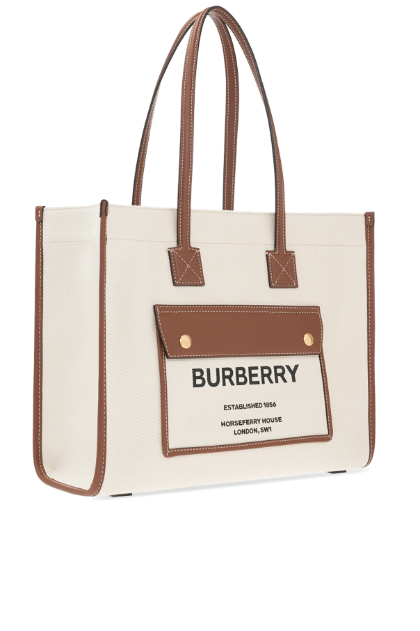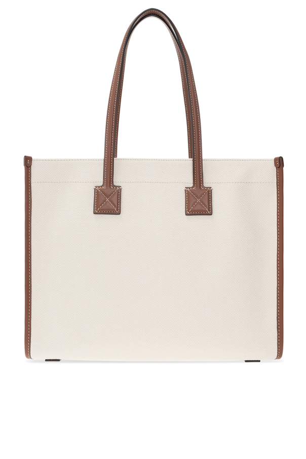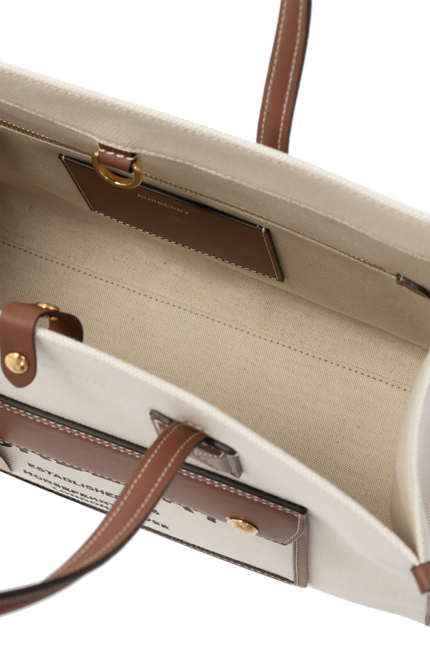 Brown and cream shopper bag from Burberry. Printed with the brand's logo in black, this design features a snap fastening, leather trims, a flapped pocket with a magnetic closure on the front, two half-round handles, gold-tone metal hardware and one internal compartment with a zipped pocket.