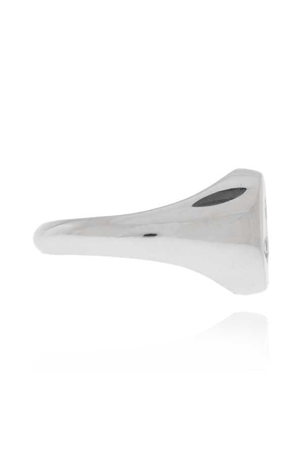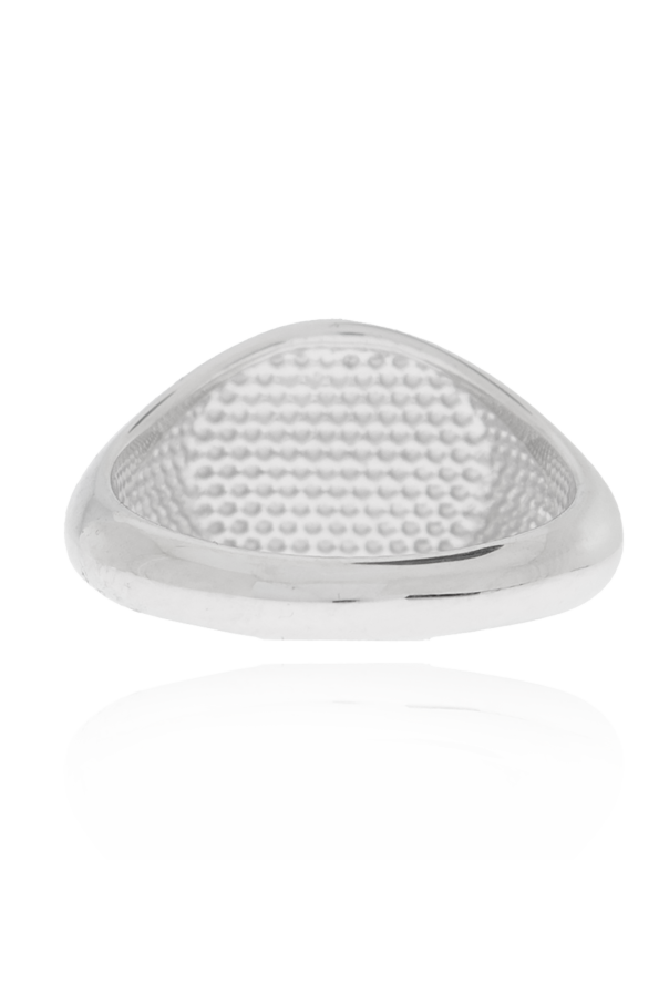 Immerse yourself in the world of elegance and refinement with the Vivienne Westwood Silver Signet Ring. Crafted from the highest quality 925 silver, this exquisite piece embodies the perfect blend of traditional craftsmanship and avant-garde aesthetics. Its substantial, rounded form with a flat top showcases a meticulously engraved pattern, a testament to the iconic Vivienne Westwood design ethos. The sides of the ring are seamlessly smooth, while the interior boasts a delicate, dotted texture, enhancing both the visual appeal and the wearing comfort. This signet ring, devoid of ostentatious logos, speaks volumes with its sophisticated design and the subtle signature of its renowned creator, making it a timeless addition to any jewelry collection. Why Purchase This Product? Exclusively crafted from premium 925 silver. Features a unique, engraved design indicative of Vivienne Westwood's revolutionary style. Designed for comfort with a textured interior. A timeless accessory that transcends fleeting fashion trends.