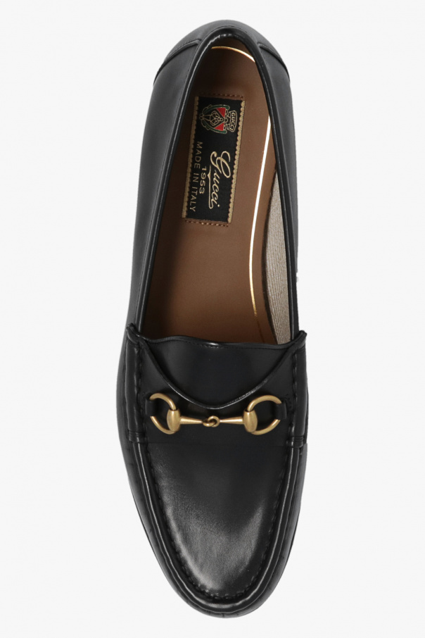 Black loafers from Gucci. Crafted from leather, this model sits on a beige leather sole and showcases decorative stitching details and the brand's signature antiqued gold-tone horsebit hardware on the front.