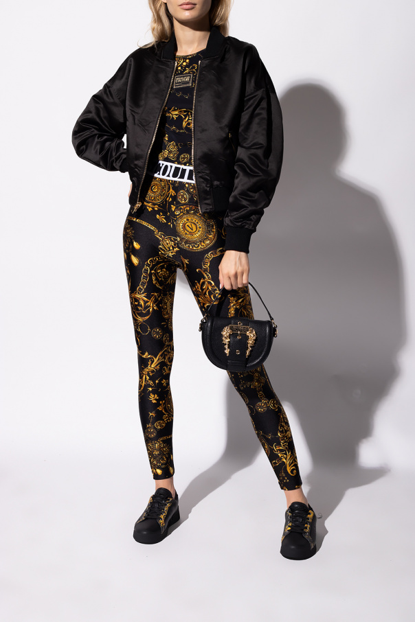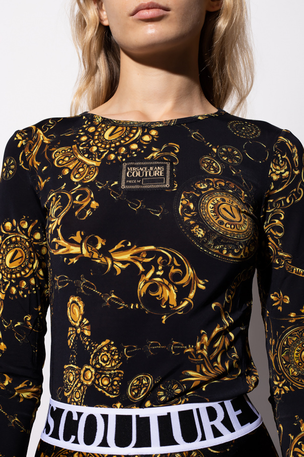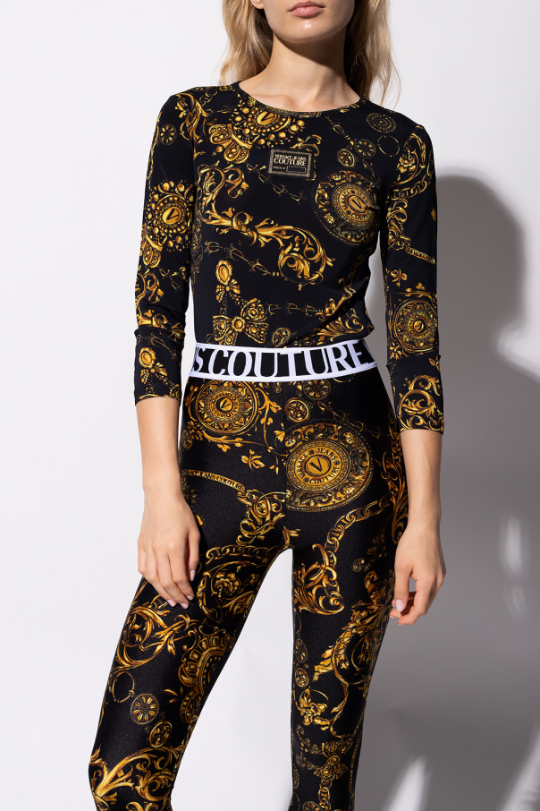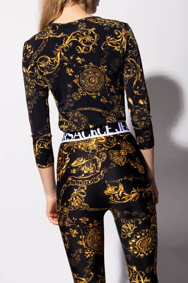 Black top from Versace Jeans Couture. This long sleeve design is enriched by the label’s signature Baroque pattern in yellow and orange as well as a logo patch in black and gold-tone.