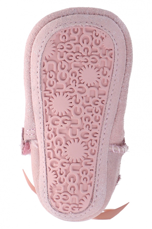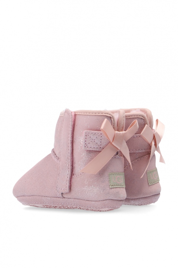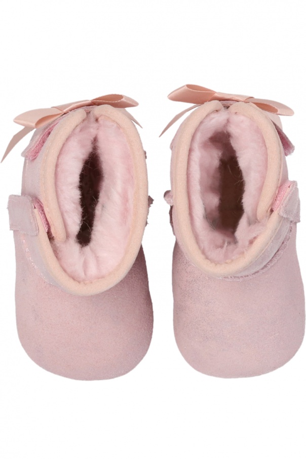 Light pink ‘Jesse Bow II Shimmer’ snow boots from UGG Kids. Made of suede lined with sheep wool. Set on a sole trimmed with pink rubber, this model fastens with velcro and is enriched with glitter, a bow and a logo patch.