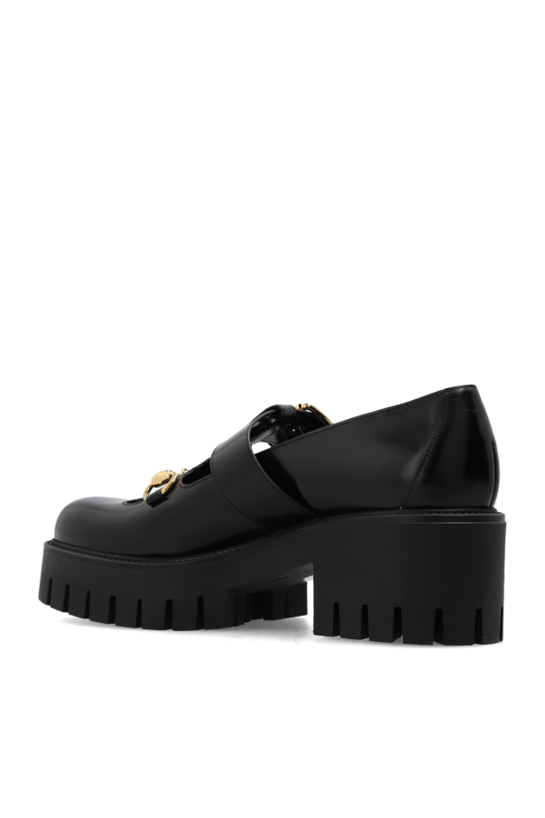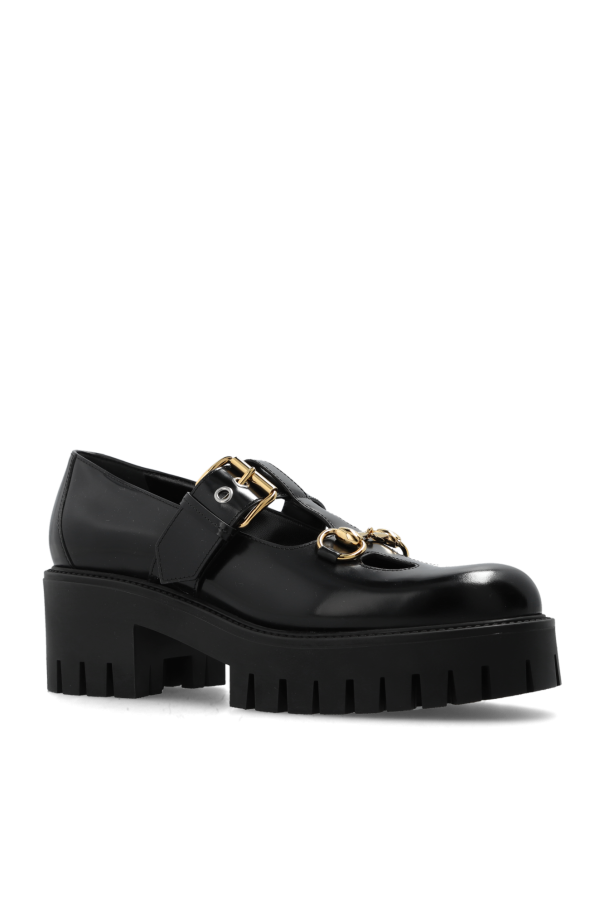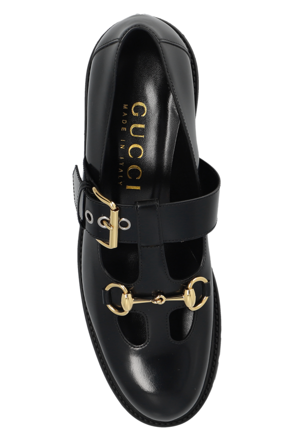 Black pumps from Gucci. Made of glossy leather, this model sits on a black rubber sole and showcases an adjustable buckle strap, decorative cutouts and the brand's signature gold-tone horsebit hardware on the front.