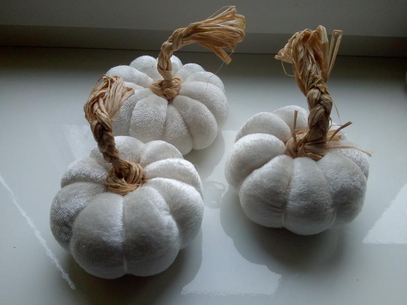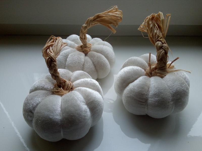 Тыква из ткани плющ белый. Наполнитель ходофайбер. Рафия. Диаметр 8.8 см та 11 см.