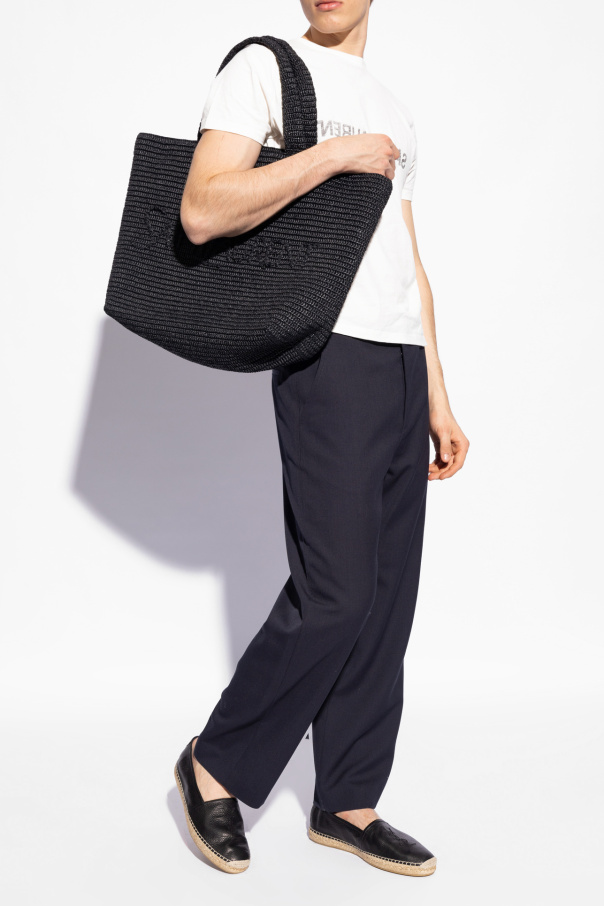 Black ‘Toscano’ espadrilles from Saint Laurent. Crafted from leather with a texture throughout, this pair boasts a slip-on silhouette with YSL branding and a beige rubber sole at the base.