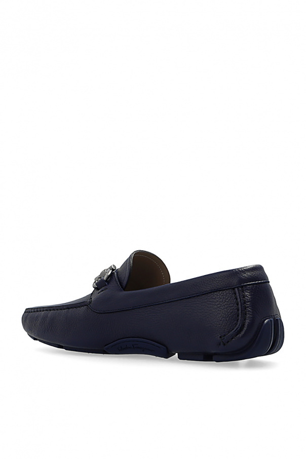 Navy ‘Parigi’ moccasins from FERRAGAMO. Crafted from calf leather, this pair features the label’s signature Gancini appliqué in silver-tone and a navy rubber sole.