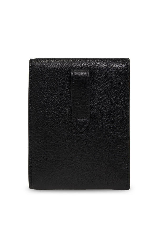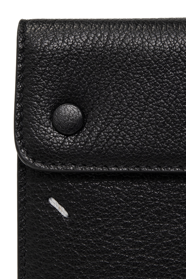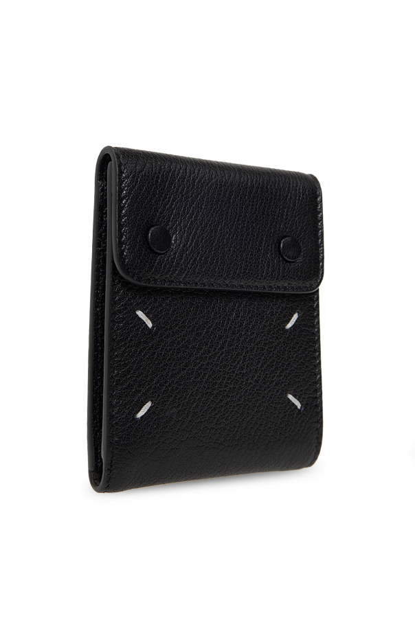 Black wallet from Maison Margiela. Crafted from grainy calf leather, this design features a flap with snap closures, the brand's signature white four-stitches moniker on the front, a belt loop at the back and a bill compartment, two slip pockets and eight card slots inside.