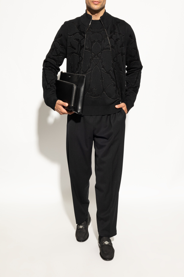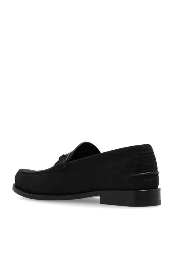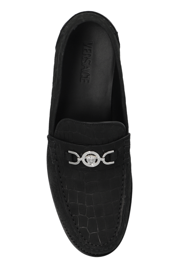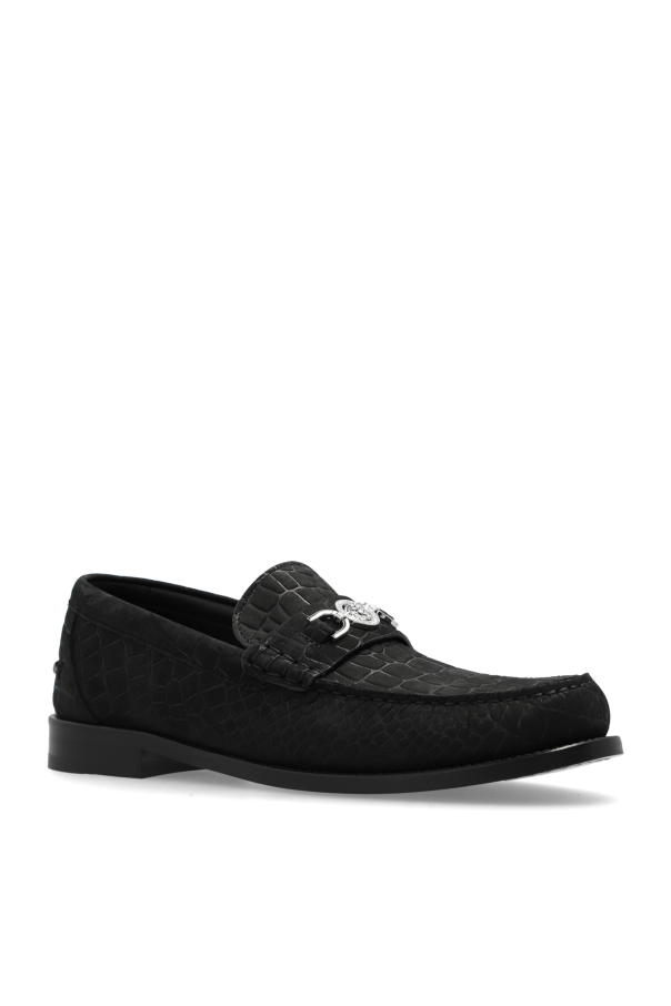 Introducing the epitome of sophistication – Versace Men’s Loafers. These exquisite loafers effortlessly blend timeless elegance with modern luxury. Crafted from premium natural leather, they feature a distinctive crocodile-embossed texture that exudes opulence. The rich black hue enhances their versatility, making them an impeccable choice for formal and semi-formal occasions. The classic slip-on design, devoid of laces, showcases the quintessential loafer silhouette, while the high-quality rubber sole ensures unmatched comfort. A striking metal designer logo adorns the front, adding a touch of refinement and brand distinction. The interior is lined with smooth leather, providing an exceptional fit and feel, further accentuated by the embossed designer logo on the insole. Why Choose These Loafers? Luxurious Material: Crafted from high-quality crocodile-embossed leather. Timeless Design: Classic loafer shape for enduring style. Designer Detailing: Features a prominent metal logo and embossed insole. Comfort: Padded leather interior and durable rubber sole for all-day wear. Versatility: Perfect for formal and semi-formal events.