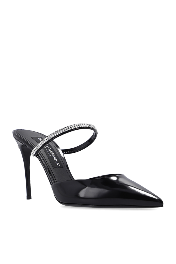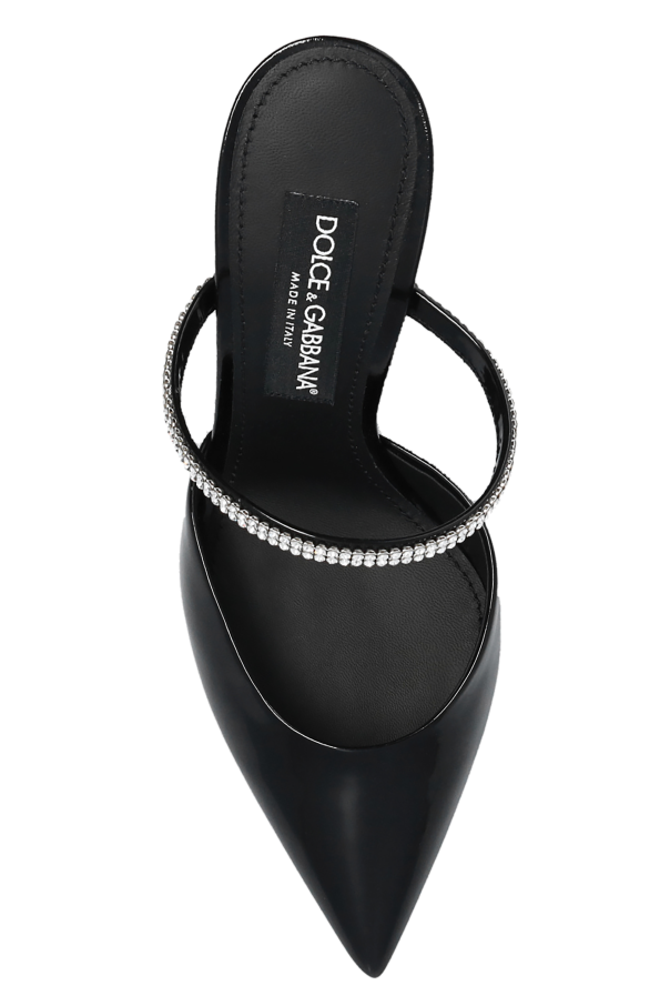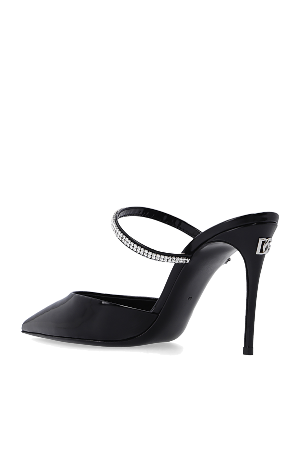 Black ‘Cardinale’ heeled mules from Dolce & Gabbana. Crafted from patent calf leather, this pair features crystals, a pointed toe, silver-tone logo appliqué and black leather sole.