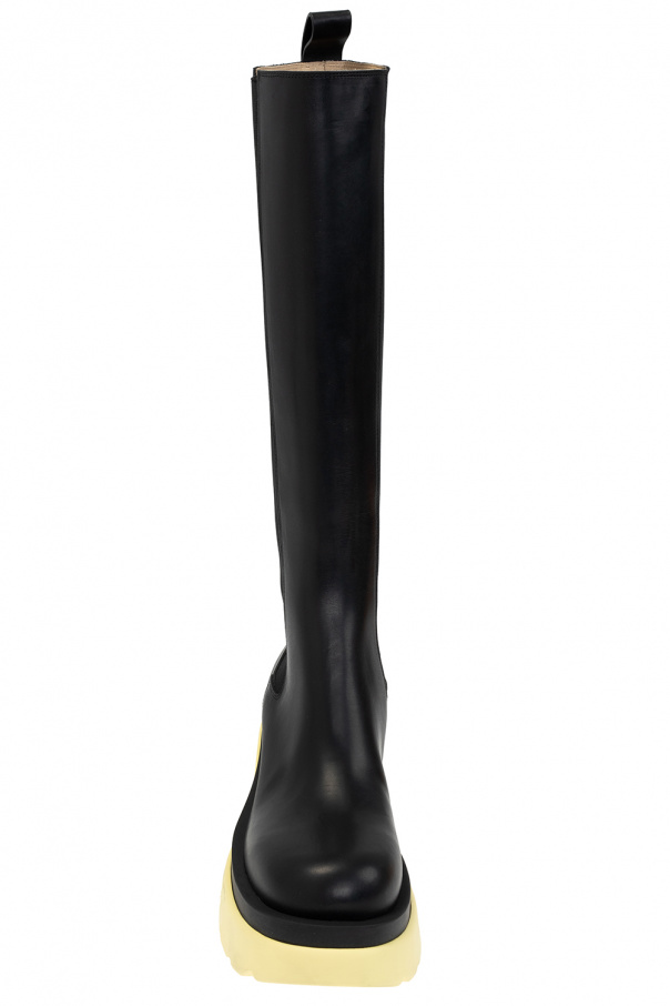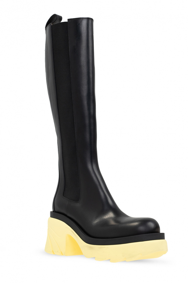 Black ‘Flash’ platform boots from Bottega Veneta. Crafted from calf leather, this pair is complete with elastic side panels and a yellow rubber sole.