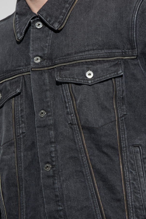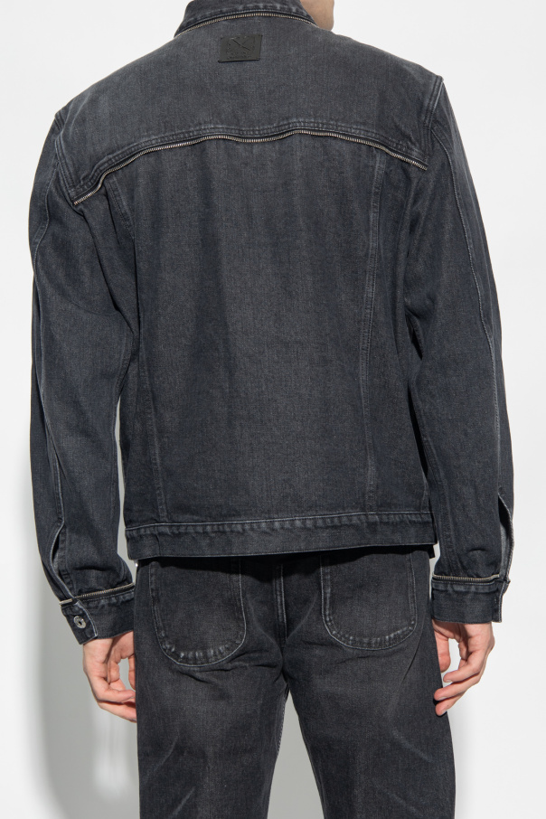 Black denim jacket from Off-White. Crafted from cotton, this long sleeve design features button fastenings, two slip pockets, two flap pocket, decorative zips, logo-embossed patch at the back and long sleeves.