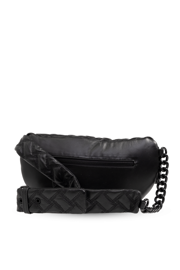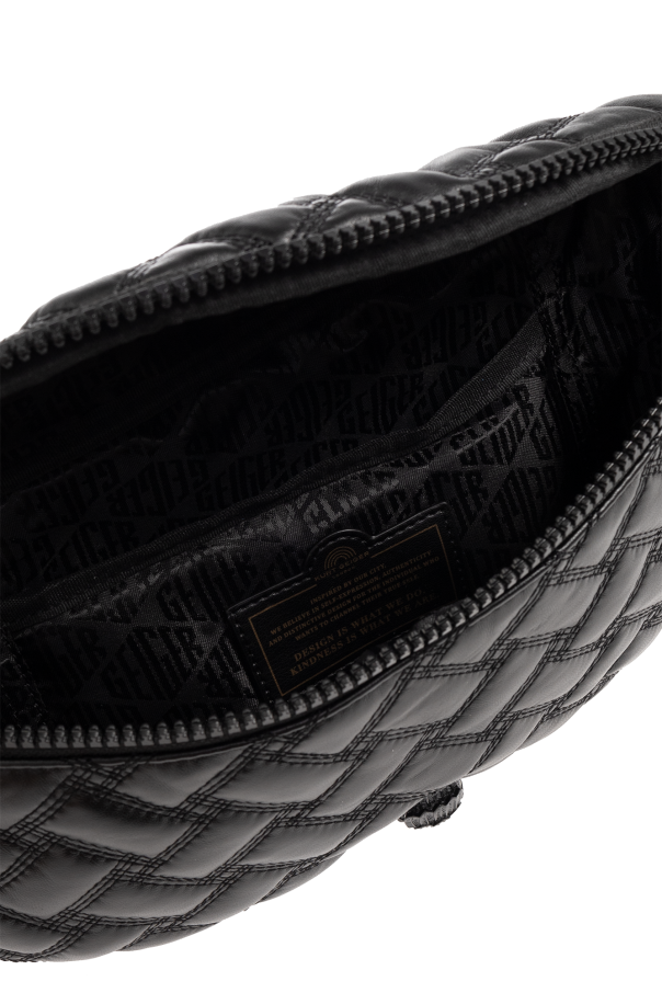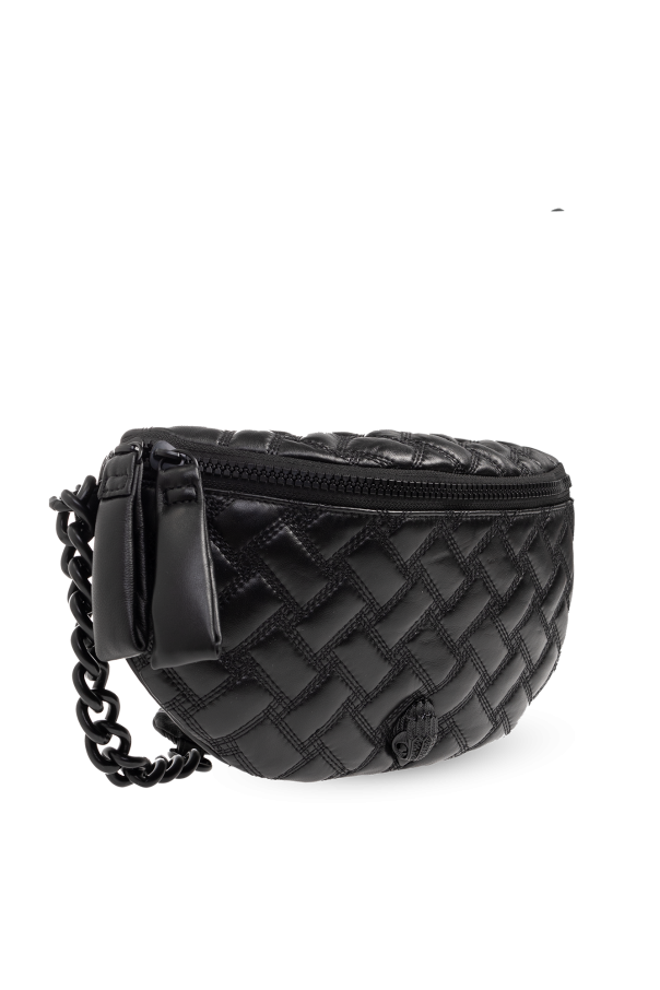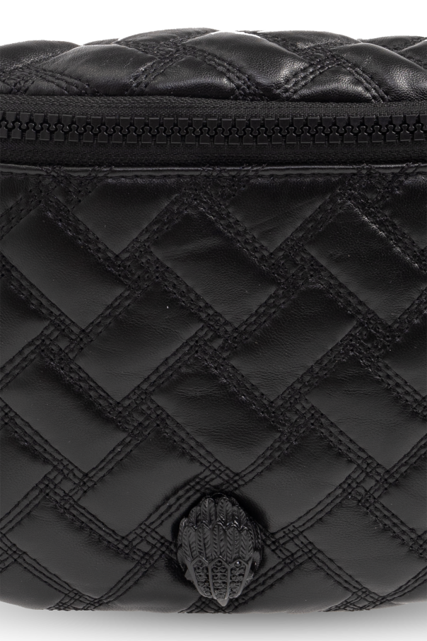 Black ‘Kensington’ quilted belt bag from Kurt Geiger. Made of leather, this design secures with a two-way zip and showcases a crystal-bejewelled metal eagle head on the front, one zip pocket on the back, an adjustable strap and one internal compartment with a slip pocket.