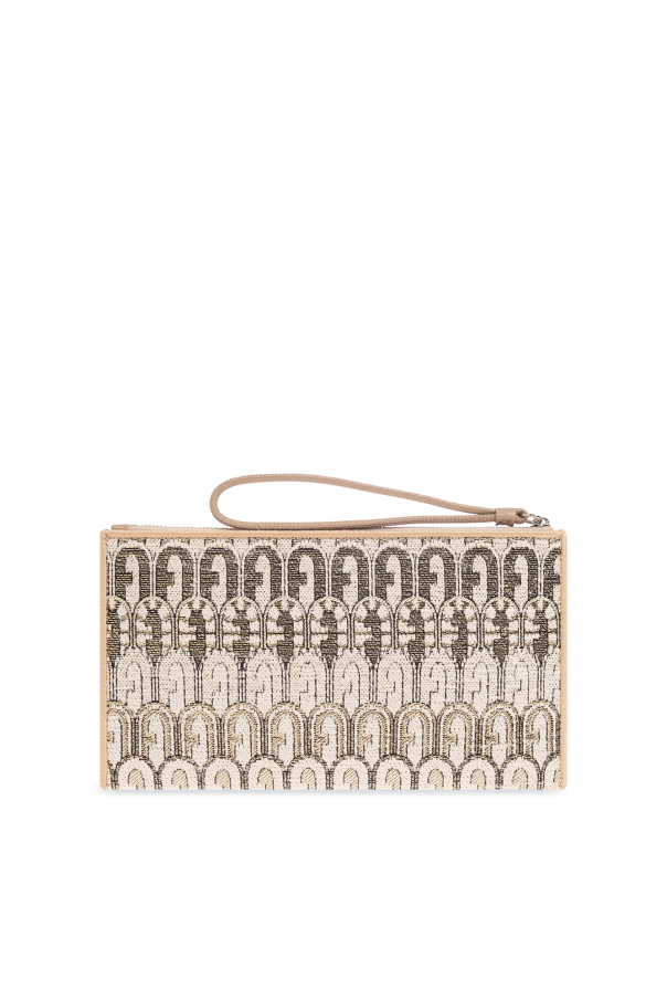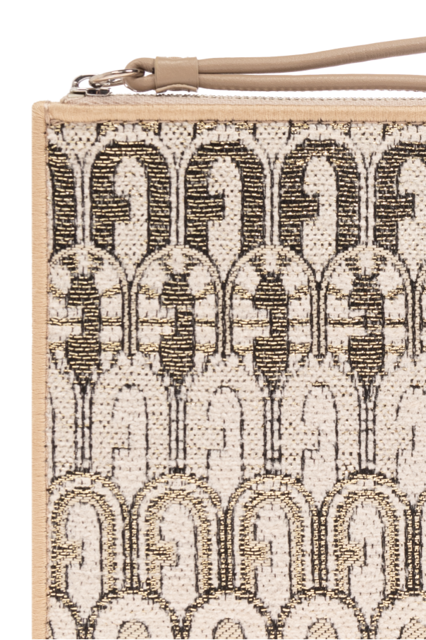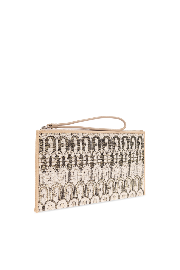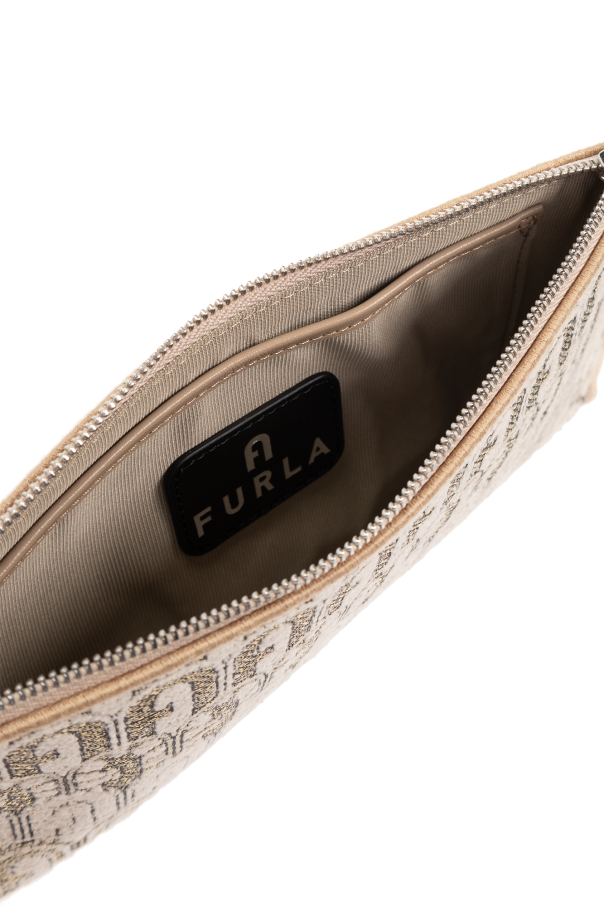 Beige and black ‘Opportunity Small’ handbag from Furla. Made of fabric with a gold-tone lurex thread monogram, this model is complete with a zip fastening, wrist strap and internal slip pocket.