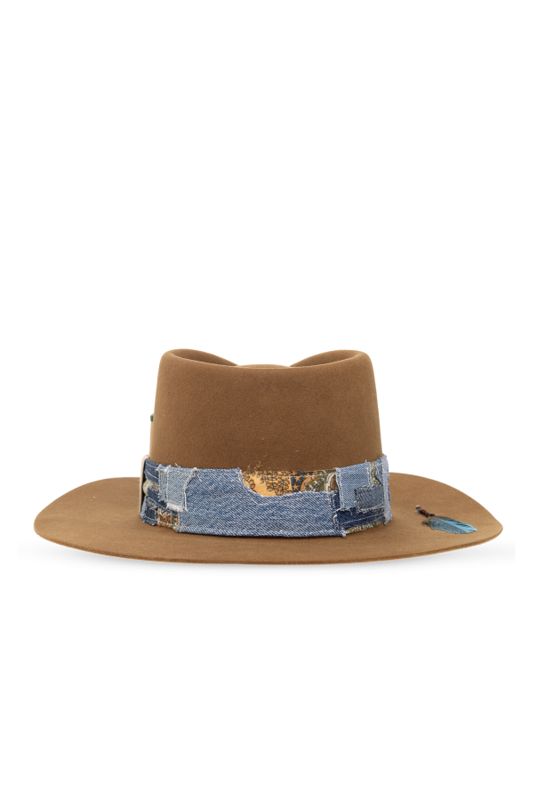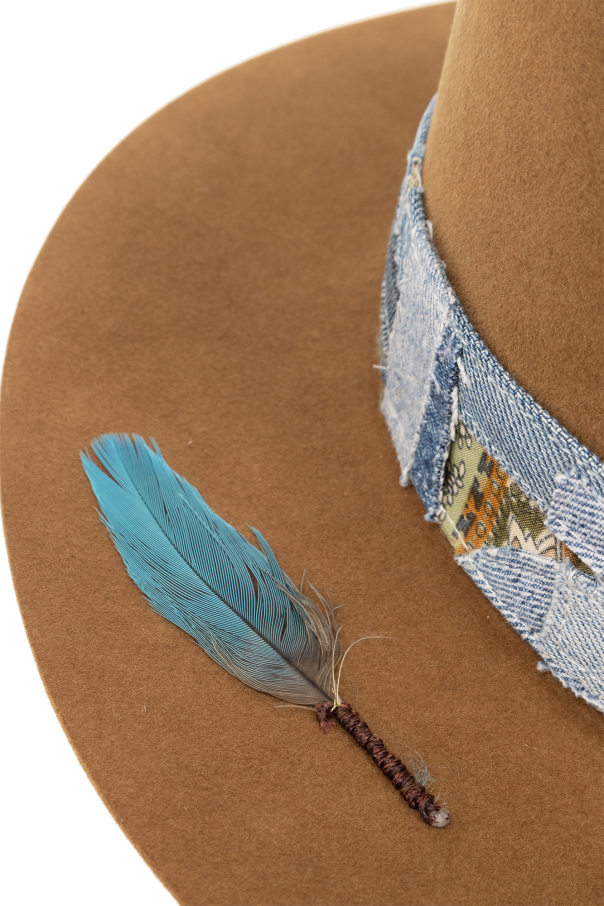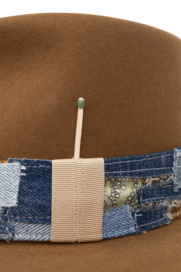 Brown ‘692’ fedora hat from Nick Fouquet. Made of felt, this item features a denim patchwork band, matchstick and blue feather.