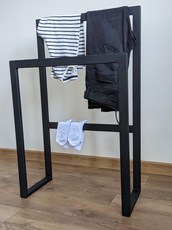 Вешалка имеет специальные накладки, чтобы не сапать пол. Надежный металлический карказ выдерживает до 100 кг веса, что не позволит ему прогнуться со временем от верхней одежды или других цупких изделий.