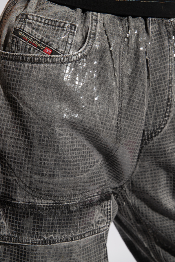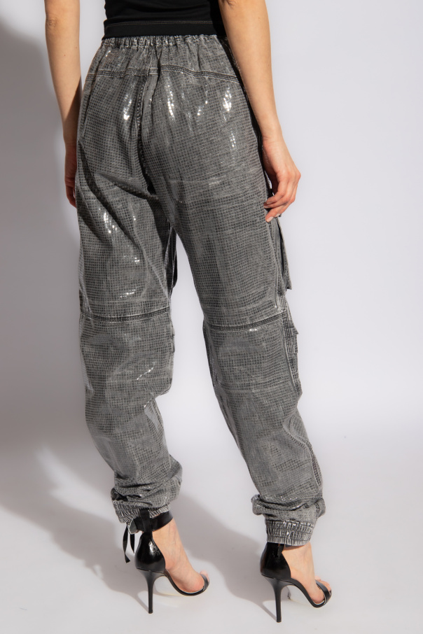 Grey ‘D-MIRT-S’ cargo jeans from Diesel. Embellished with glossy transparent appliqués, this pair features a drawstring waistband, multiple pockets and elasticated cuffs with drawstrings.