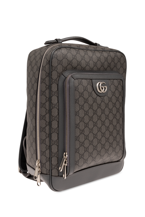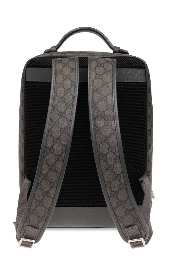 Grey ‘Ophidia Medium’ backpack from Gucci. Made from ‘GG Supreme’ canvas and leather, this design fastens via a two-way zip and showcases a zip front pocket accentuated with a metal logo plaque, one half-round handle, adjustable shoulder straps, silver-tone metal hardware and one internal compartment with one zip pocket and one slip pocket.