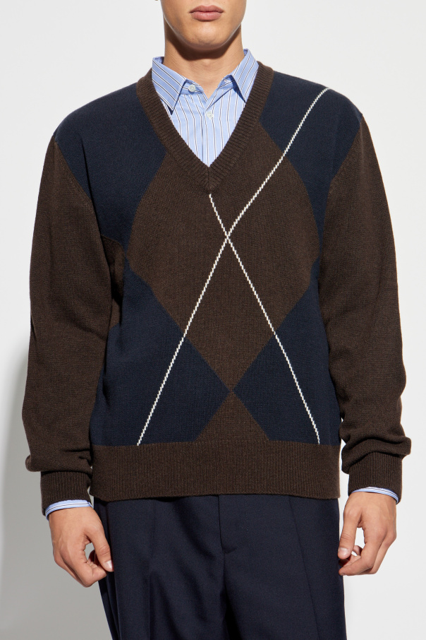 Introducing the exquisite Virgin Wool Sweater from the exclusive collection by Officine Generale. This luxurious piece is a testament to timeless elegance and sophisticated craftsmanship. The sweater features a classic V-neck design with long sleeves adorned by ribbed cuffs, ensuring a perfect blend of style and comfort. The dominant argyle pattern, presented in shades of brown and navy with white lines, graces the front, adding a touch of refined geometry to your wardrobe. Crafted from the finest virgin wool, this sweater provides unparalleled warmth and comfort, making it an ideal choice for both casual and formal occasions. The ribbed neckline and subtle white stitching further enhance its minimalist and elegant design, free from overt branding. The rich brown hue, complemented by deep navy elements within the pattern, ensures versatility and a classic appeal. This sweater pairs effortlessly with blazers, shirts, and elegant trousers, showcasing a style that is both timeless and contemporary. Why Choose This Product? Exquisite craftsmanship by Officine Generale Elegant argyle pattern in sophisticated colors Warm and comfortable, crafted from 100% virgin wool Versatile design suitable for various occasions Minimalist aesthetic with detailed ribbed finishes