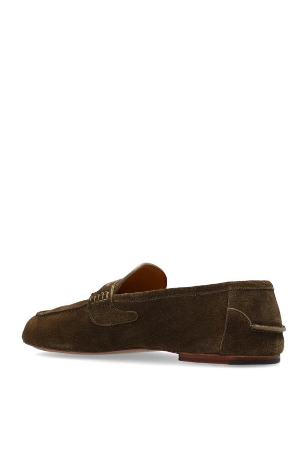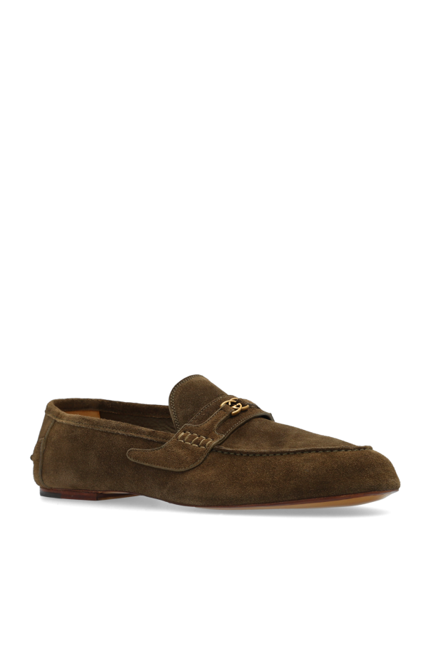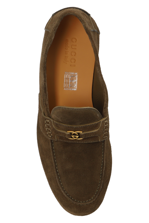 Brown loafers from Gucci. Made from suede, this model sits on a brown leather sole and showcases a frontal strap with antiqued gold-tone logo hardware.
