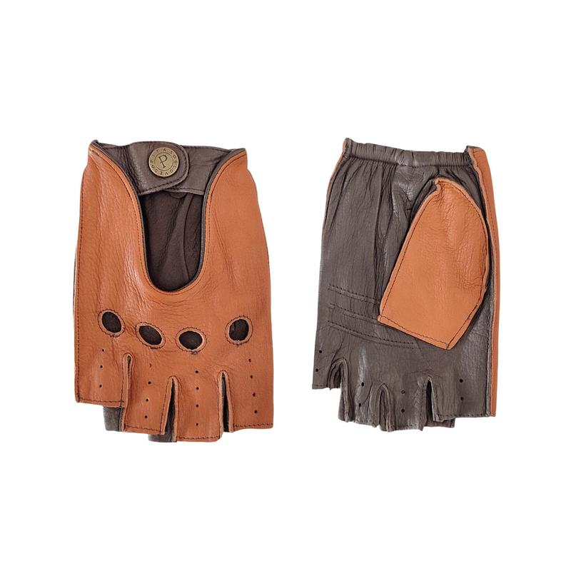 Мужские беспалые кожаные коньячные комбинированые перчатки из мягкой