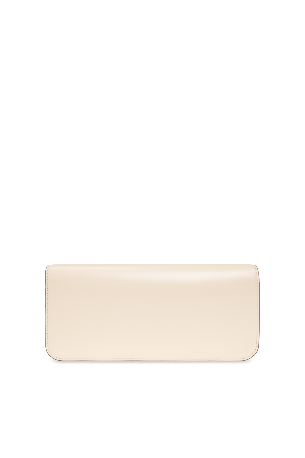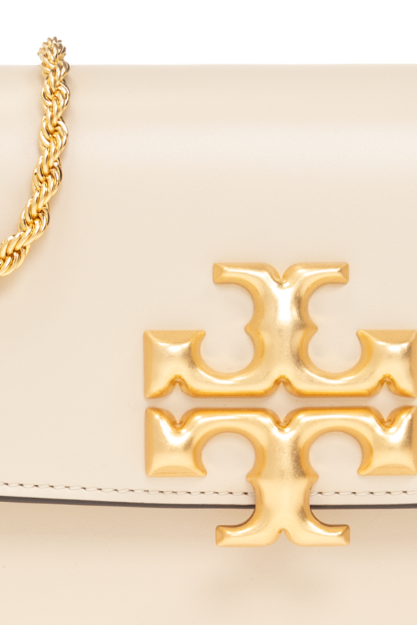 Cream ‘Eleanor’ clutch from Tory Burch. Made of leather, this item features a magnetic closure with a metal logo detail, detachable shoulder chain, gold-tone metal hardware and three separate internal compartments.