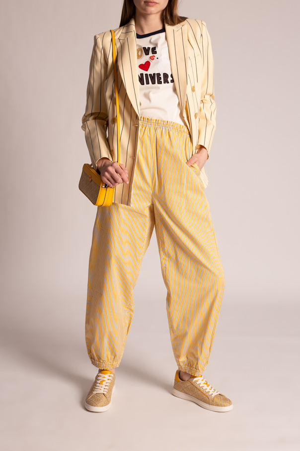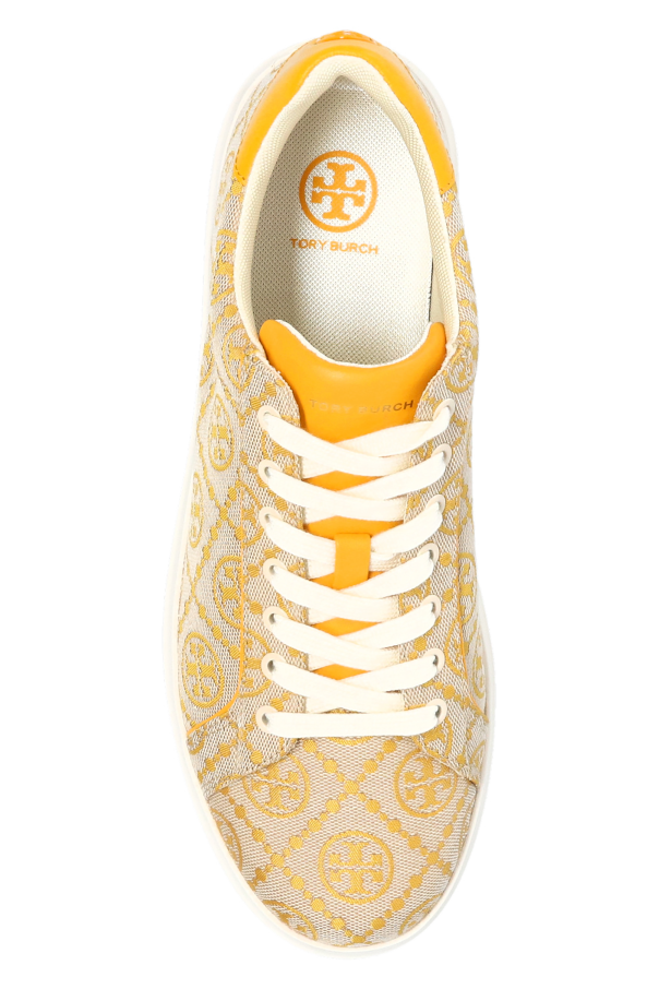 Beige 'T Monogram' sneakers from Tory Burch. Crafted from canvas with yellow leather trims, this pair features an embroidered logo pattern and a white rubber sole.