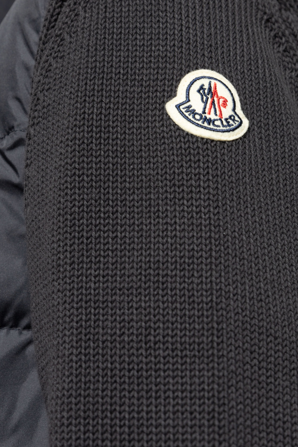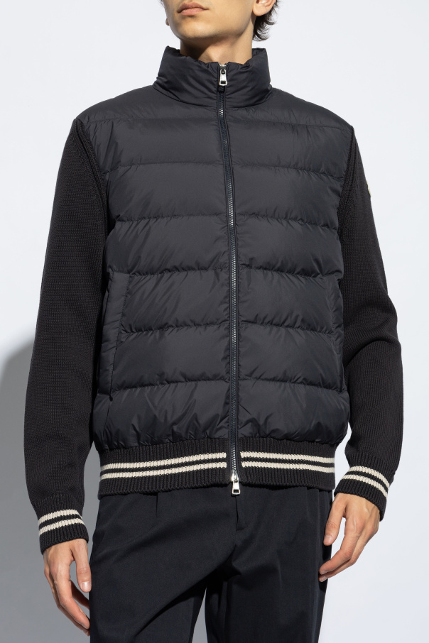 Introducing the Moncler Hybrid Quilted Jacket, a masterpiece of design and functionality that seamlessly blends the warmth of quilted insulation with the comfort of knitwear. Crafted in a sophisticated navy hue, this jacket is a testament to Moncler's commitment to high-quality materials, combining cotton and polyester for a luxurious yet practical finish. The front of the jacket features a quilted pattern, providing essential warmth for cooler days, while the sleeves and back are designed with a soft knit fabric, introducing a unique, hybrid aesthetic. The jacket's sporty character is accentuated by contrasting white and navy stripes on the cuffs and hem, and a high, stand-up collar offers additional protection against the chill. A discreet, dual-direction zipper ensures a sleek closure, blending effortlessly into the jacket's design. Noteworthy is the designer's logo placed on the left sleeve, marking the jacket with Moncler's signature emblem of quality. With its versatile style, this jacket is easily classified as a premium garment, reflecting the brand's reputation for superior craftsmanship and innovative design. Why Purchase This Product? Exclusive Design: A unique blend of quilted and knit textures offers a distinctive, hybrid style. Quality Materials: Crafted from a blend of cotton and polyester, ensuring both comfort and durability. Functional Features: Equipped with a dual-direction zipper and snap-button pockets for practicality and ease of use. Signature Detailing: Adorned with the iconic Moncler logo on the left sleeve, showcasing the brand's heritage. Sporty Elegance: Contrasting stripes and a stand-up collar add a dynamic, sporty touch to this elegant piece.