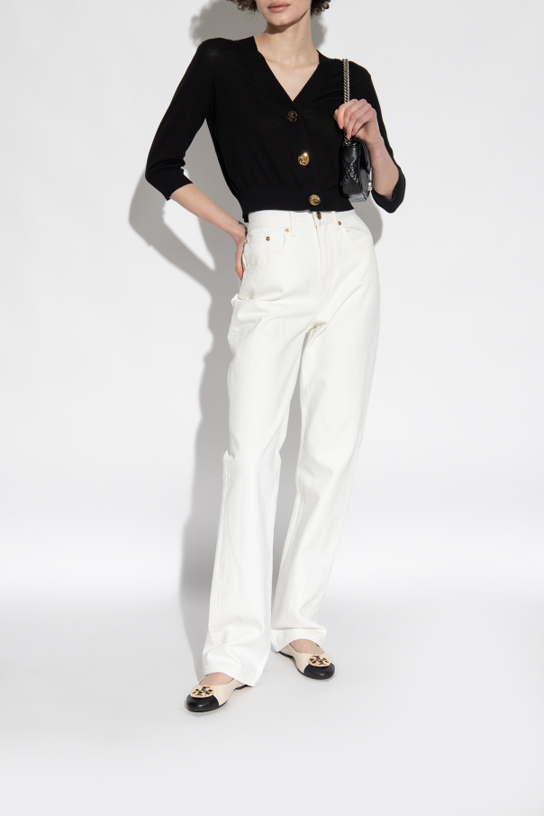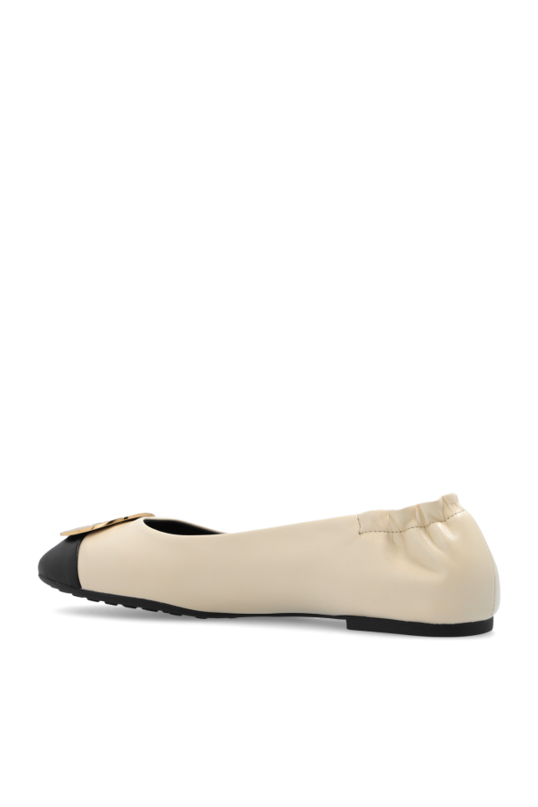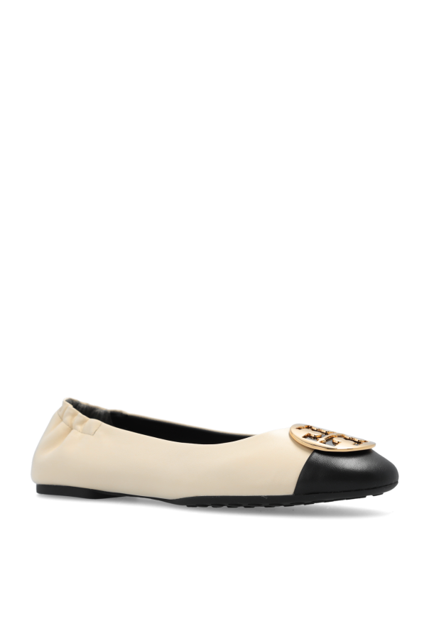 Cream and black ‘Claire’ ballet flats from Tory Burch. Made of leather, this model sits on a black rubber sole and features an elasticized heel counter and gold-tone logo hardware on the front.