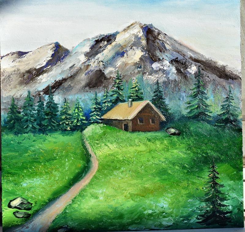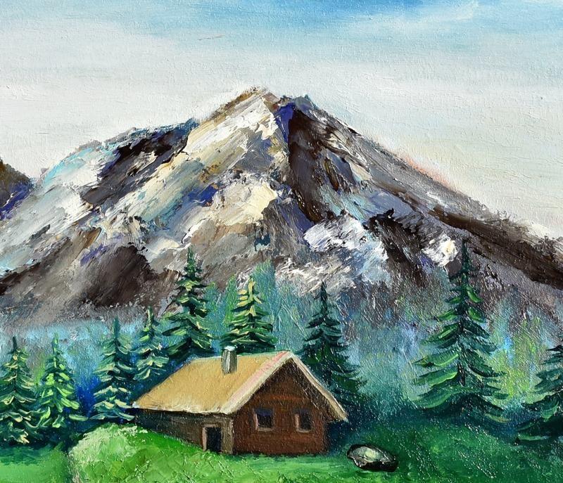 Картина, с уютным горным пейзажем, оргалит(двп для художественных работ), размер 30х30 см. На живописный слой нанесен защитный лак. Такая картина внесет солнечный настроение в интерьер.