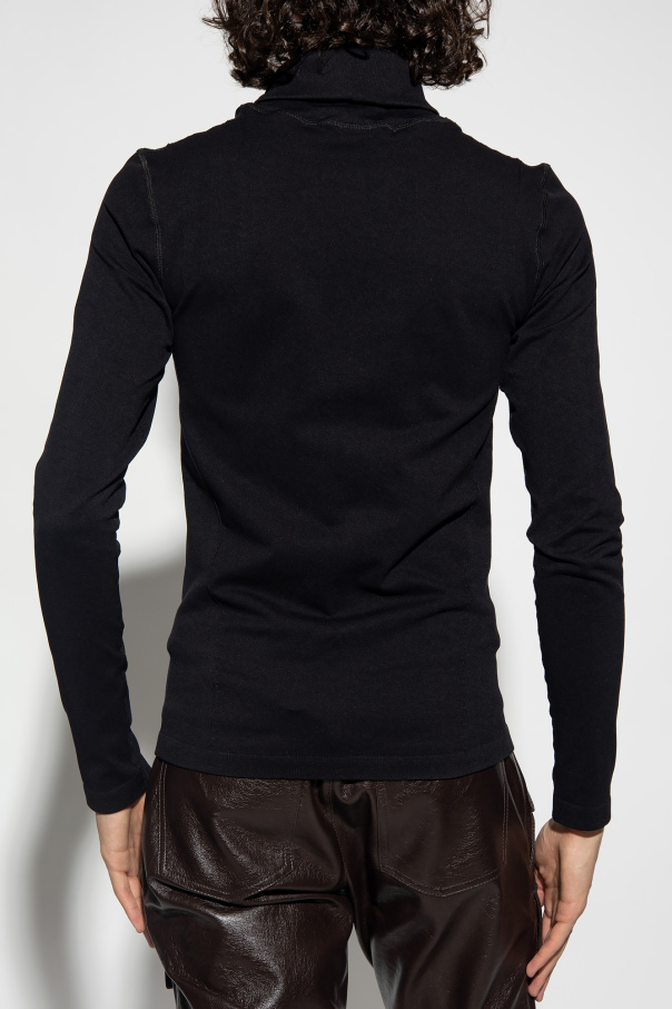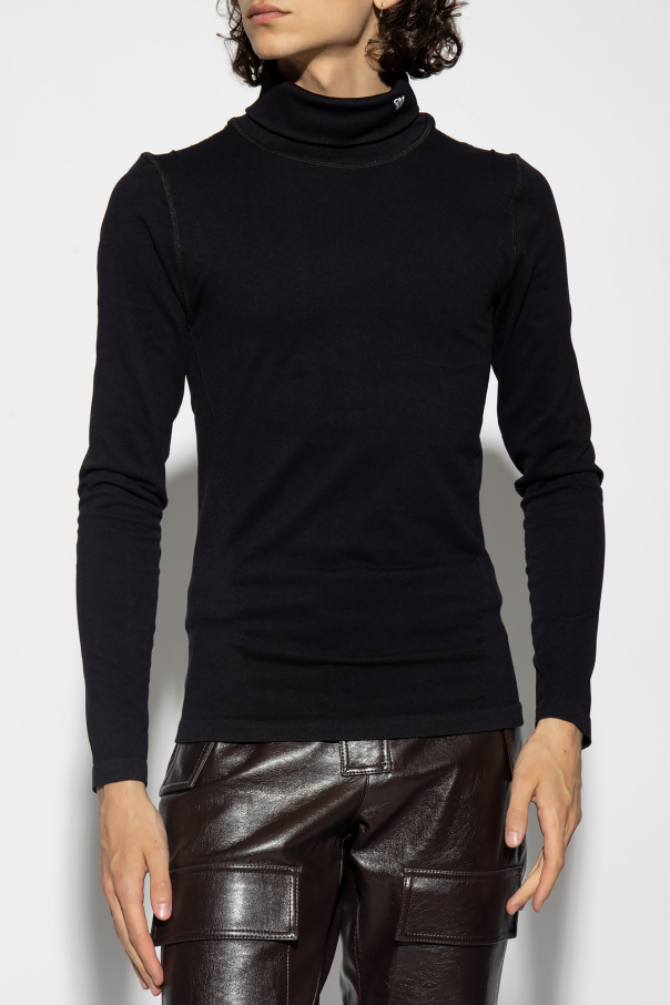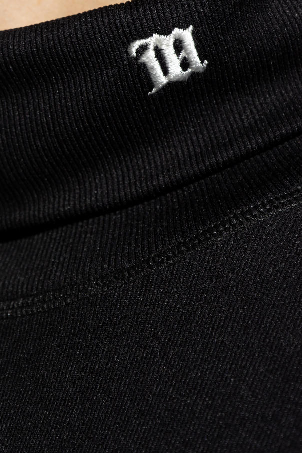 Black turtleneck top from MISBHV. Crafted with a ribbed knit, this style showcases an embroidered white logo and elasticized trims on the bottom hem and long sleeves.