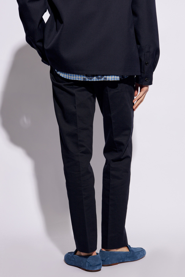 Navy blue chino trousers from Gucci. Made from cotton, this pair falls with slightly tapered legs and features a zip fly with a hook & eye closure, two slip pockets, two button pockets as well as green-red-green Web belt loops.