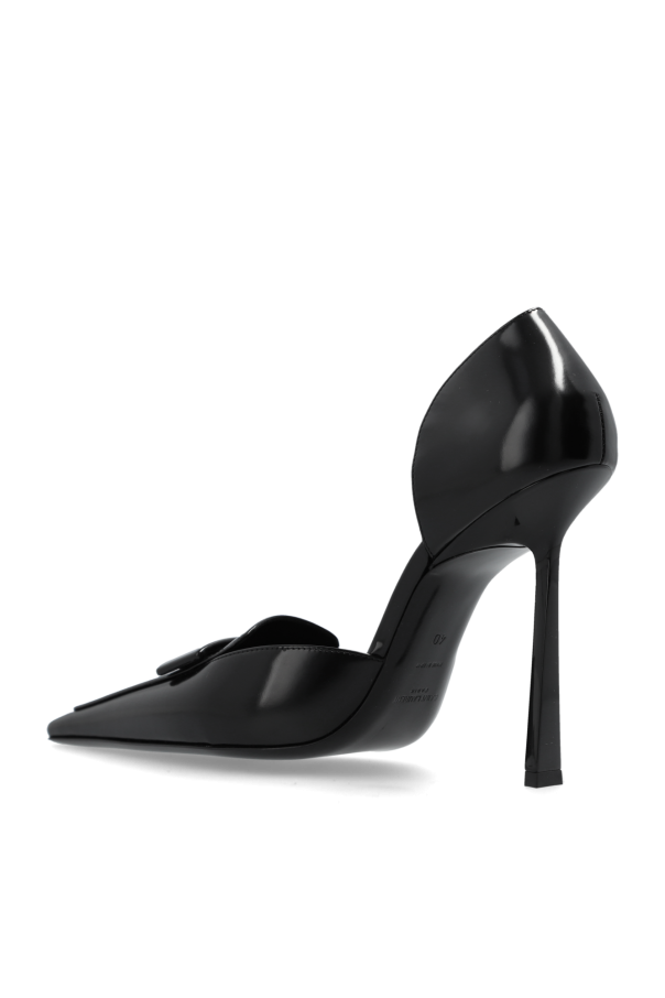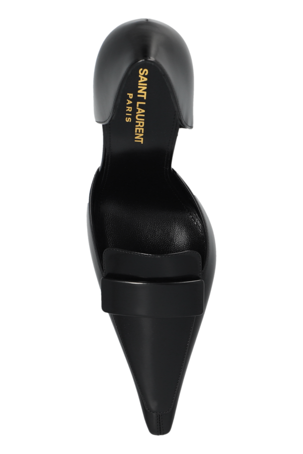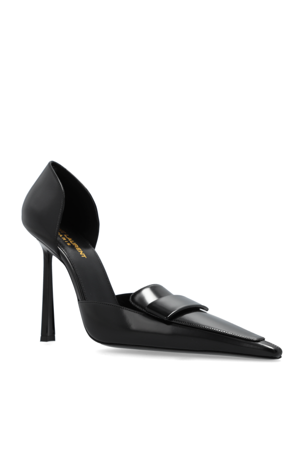 Introducing the exquisite D'Orsay High-Heel Pumps from the exclusive Saint Laurent collection. These black pumps epitomize sophistication and timeless elegance, making them an essential addition to any discerning wardrobe. Crafted from smooth, glossy leather, these shoes boast a classic d'Orsay design with side cutouts that elegantly reveal the arch of the foot. The pointed toe adds a touch of refinement, while the high, slender stiletto heels provide both height and a sleek silhouette. Despite their height, the heels are designed to offer stability and support. An elegant strap adorns the front of the shoe, serving as a distinctive decorative element. The interior is lined with high-quality material for maximum comfort, and features the iconic gold lettering of the Saint Laurent brand, a hallmark of luxury. Why Purchase This Product? Perfect for evening outings, formal occasions, or as a chic office accessory. Minimalist yet stylish and timeless design. Made from premium leather, ensuring durability and luxury. Iconic Saint Laurent branding, synonymous with elegance and prestige.