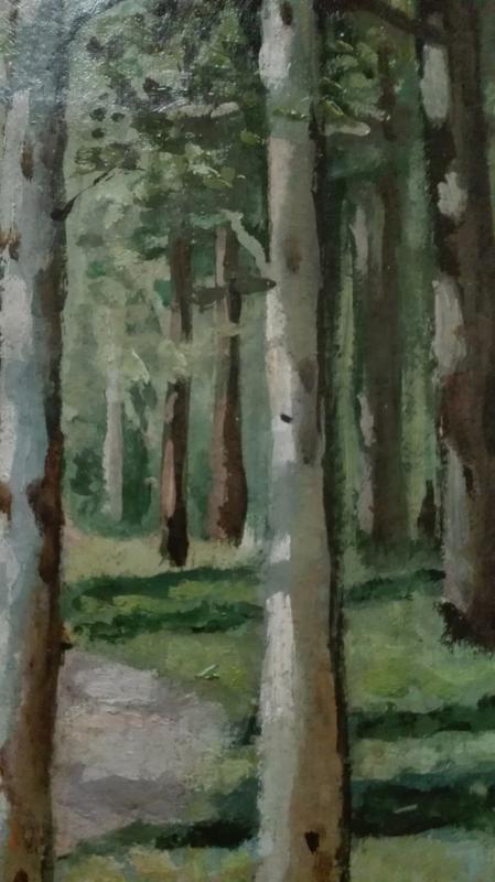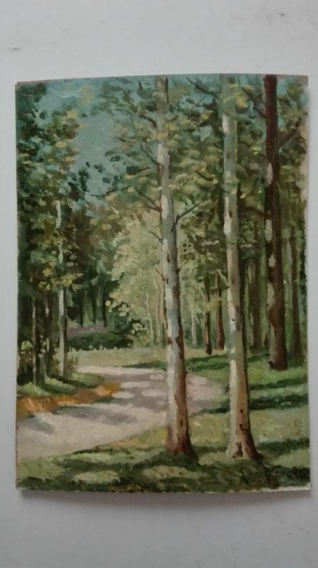 Пейзаж 1963г. Дорога в лесу под Киевом советского художника Власова Владимира Григорьевича (1927-1999гг.) представителя и продолжателя традиций Южнорусской Школы живописи, жил и работал в Одессе , гарантировано подлинный пейзаж , исполнен маслом на картоне , с подписью, и Паспортом твору, который давался на картину художника для продажи через магазин, что в советское время было для художника очень престижным, потому что нужно было разрешение на такую продажу и большинство художников не могли продавать картины через магазины, оно давалось уровневым заслуженным художникам и было для них дополнительным зароботком, поэтому на такие продажи художники как правило старались дать лучшие свои работы. Пейзаж исполнен в умеренно светлом насыщенном колорите, в характерной для художника Власова манере письма, сюжет классический для русской живописи, в работе подчеркнуто простой сюжет, в котором нет ничего лишнего, состояние хоршее фактический размер 36см на 26см.