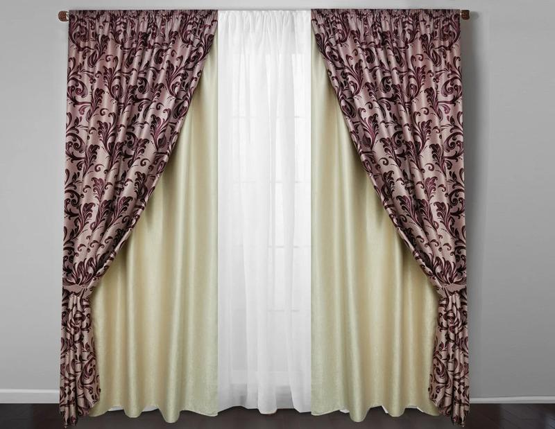 До комплекту входять 4 штори та 2 підхоплювачі.Ширина кожної штори 1.5(на замовлення зробите більшу або меншу ширину)