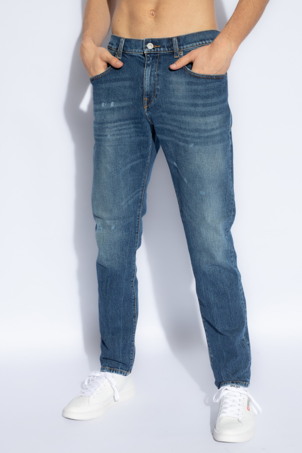 Blue ‘2019 D-STRUKT L.30’ distressed jeans from Diesel. Fastened with a zip and button, this mid rise pair features a logo patch, five slip pockets and slim fit legs.