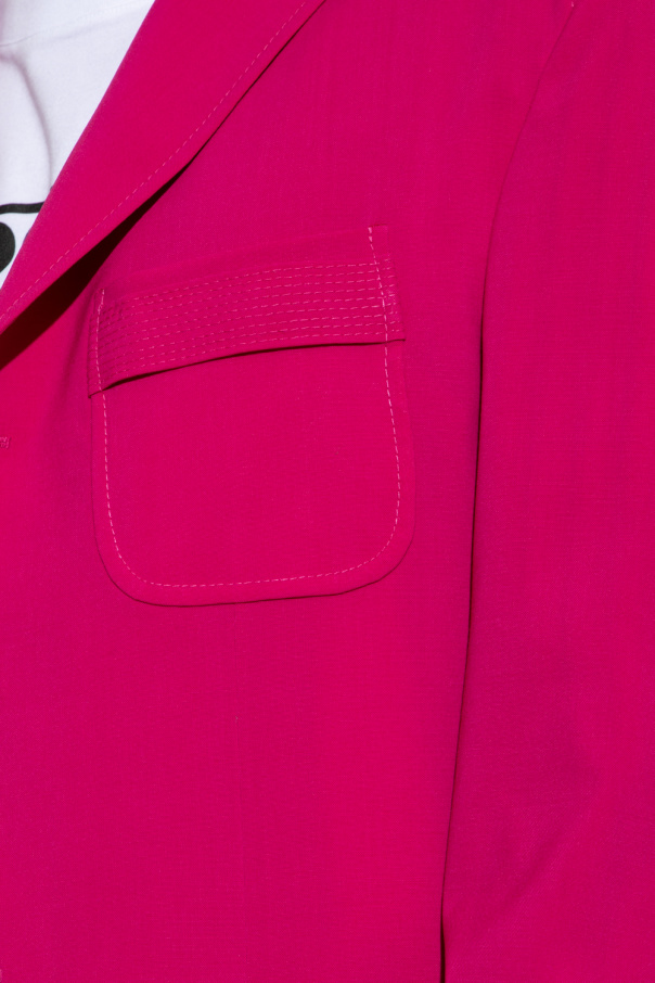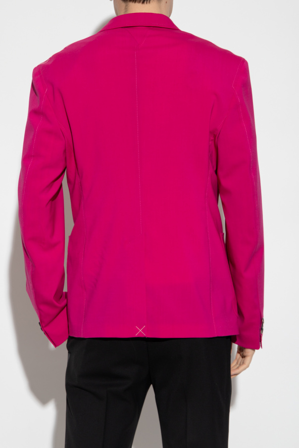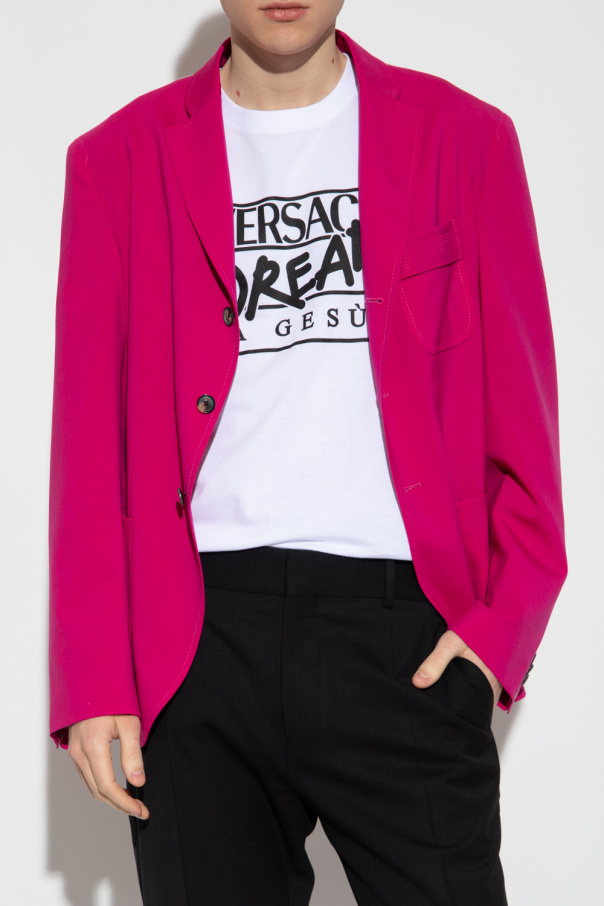 Pink blazer from Versace. Crafted from wool, this garment features button fastenings, a strap with a clasp closure and Medusa Biggie appliqué in gold-tone, decorative stitching details, three slip pockets, single rear vent, notch lapels and buttoned cuffs.