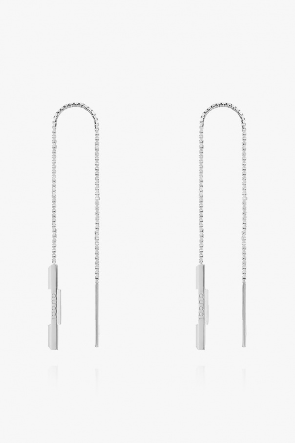 Silver-tone drop earrings from Gucci. Made of 18k white gold, they feature distinctive geometrical charms with an engraved logo and are encrusted with 24 diamonds totalling approximately 0.28 carats.
