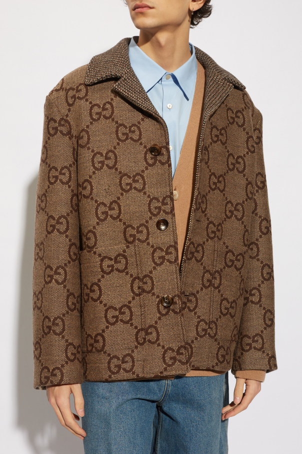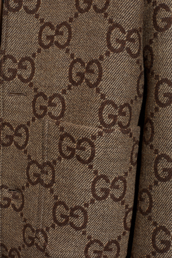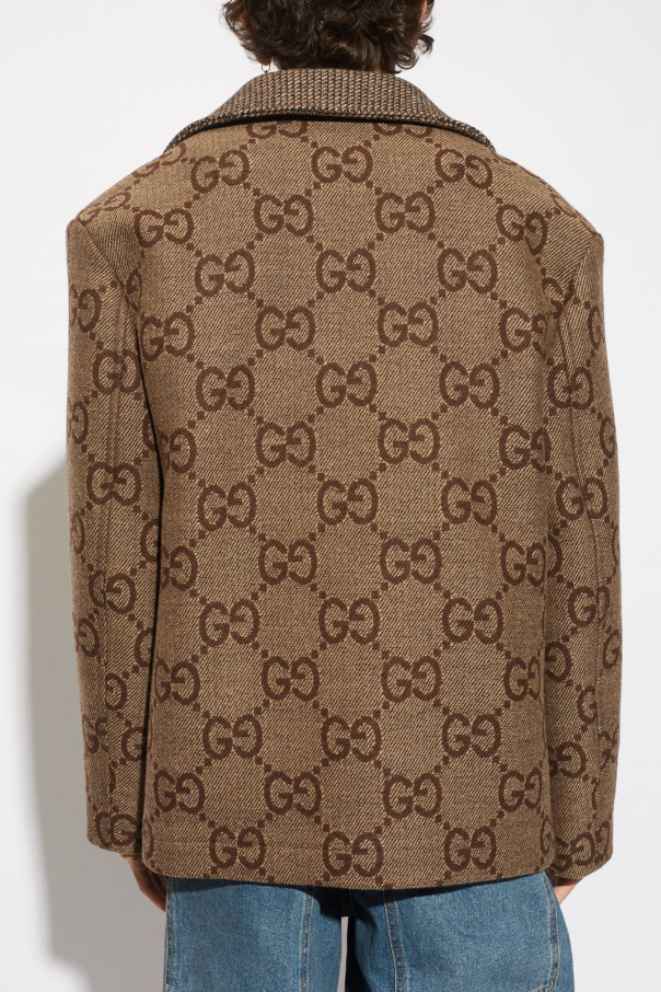 Short, beige and cream coat from Gucci. Made of wool, this design features buttons, a monogram pattern, notch lapels, two slip pockets and long sleeves.