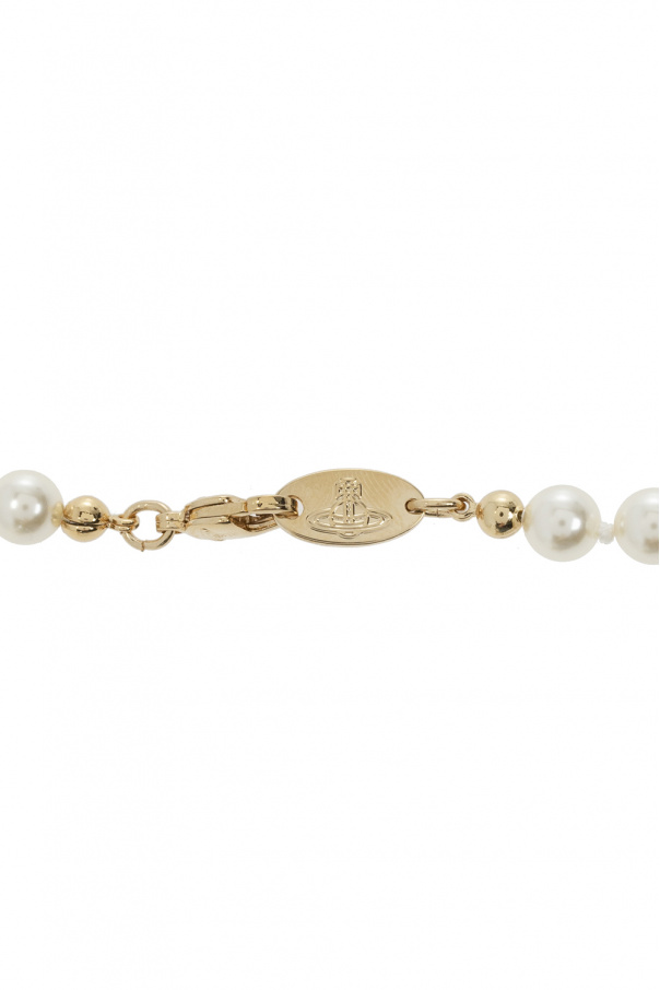 Gold-tone ‘Mini Bas Relief’ choker from Vivienne Westwood. Made of faux pearls, this design features a lobster clasp and a brass charm embellished with crystals.