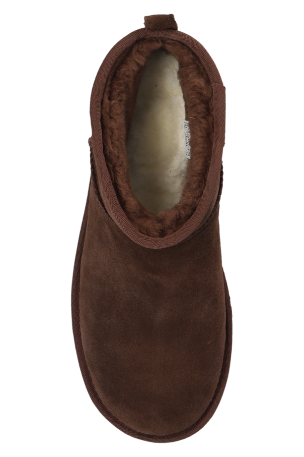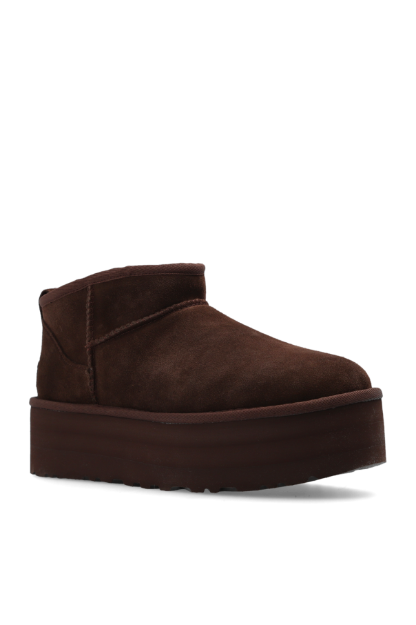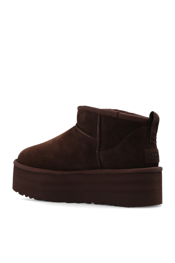 Dark brown ‘Classic Ultra Mini’ platform boots from UGG. Made of suede with a slip-on silhouette, this model sits on a dark brown rubber sole and features a logo patch on the back and the brand's signature UGGplush™ wool-blend insole.