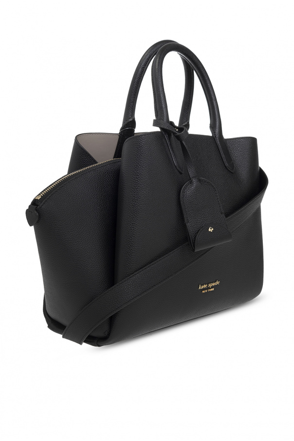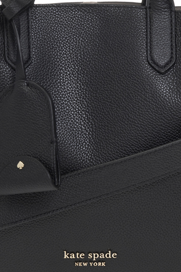 Black ‘Avenue Medium’ handbag from Kate Spade. Crafted from grainy leather, this design secures with a lobster clasp fastening and features a metal logo plaque on the front, two half-round handles, a detachable and adjustable shoulder strap, a keyring charm, gold-tone metal hardware and three separate compartments (one is zipped), three slip pockets and one zip pocket inside.