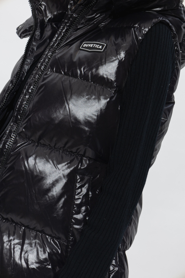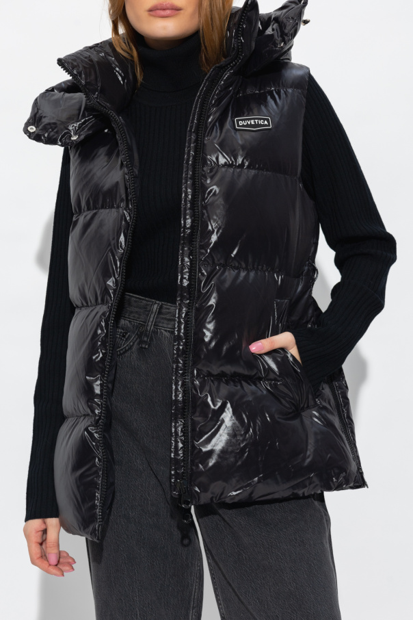 Black ‘Alloro’ quilted down vest from Duvetica. Fastened with a two-way zip, this design features a logo patch, detachable drawstring hood, two zip pockets, drawstring waist and zips at the sides of the hem.