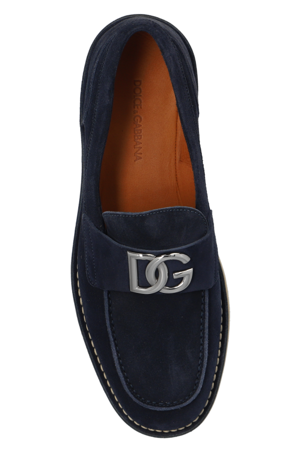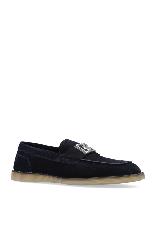 Navy blue ‘New Florio’ loafers from Dolce & Gabbana. Made from suede, this model sits on a beige rubber sole and features a frontal strap accentuated with silver-tone logo hardware.