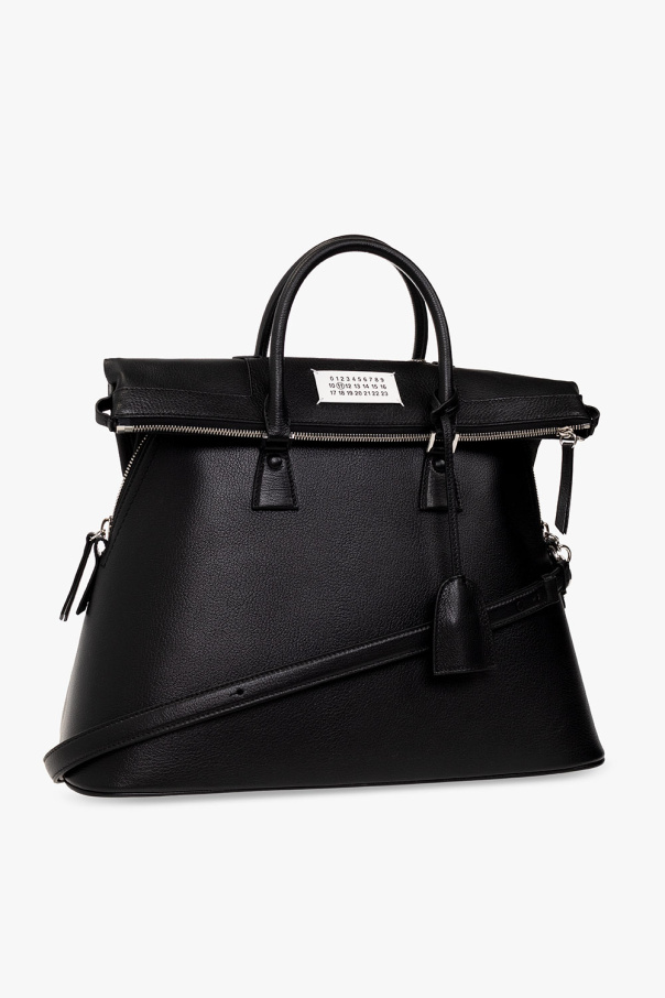 Black '5AC' shoulder bag from Maison Margiela. Crafted from textured calf leather, this design fastens with a two-way zipper and features a white logo patch on the front, two half-round handles, an attached padlock, a detachable chain shoulder strap, silver-tone metal hardware and one internal compartment.