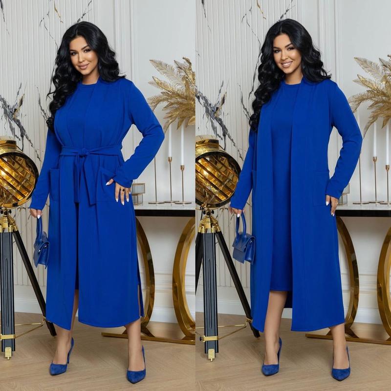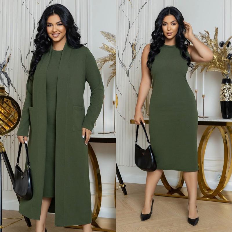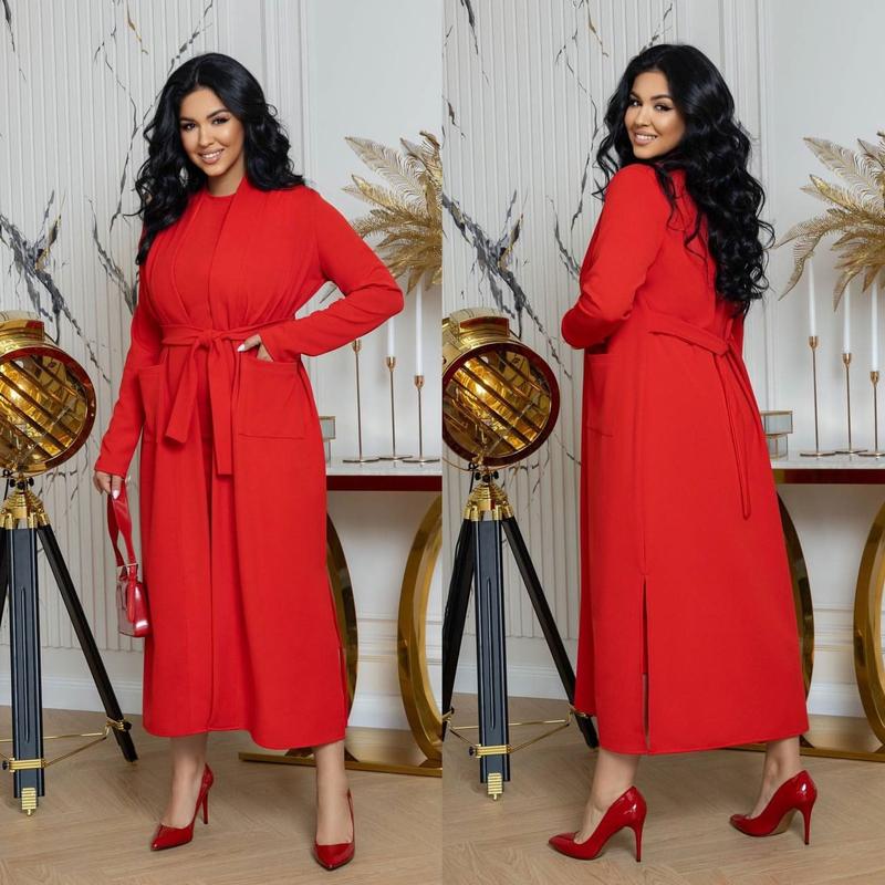 Практичный и стильный костюм, длинный кардиган + платье. Кардиган прямого покроя, на запах, с поясом, и карманами. Платье без рукава приталенного покроя. Ткань хорошего качества, износостойкая, не линяет, не кашлатится, приятная на ощупь, красиво тянется. Хорошая растяжимость. Длина кардигана: 130 см. Длина рукава: 65 см. Длина платья: 120 см (пояс на резинке).