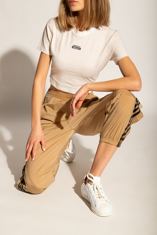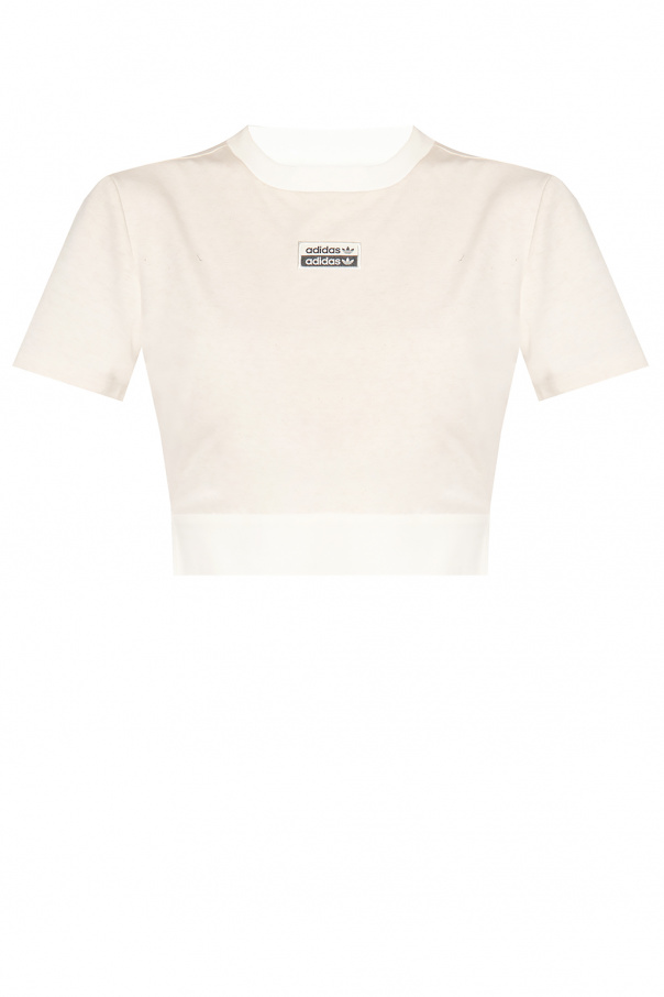 Beige crewneck T-shirt from ADIDAS Originals. Made of cotton with a cropped silhouette, this item features a black and white logo patch and an elasticated band on the bottom hem.