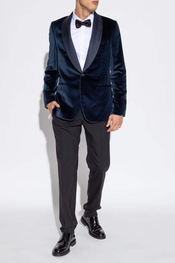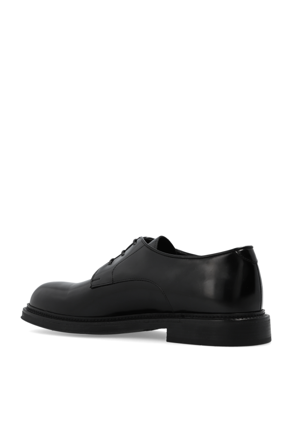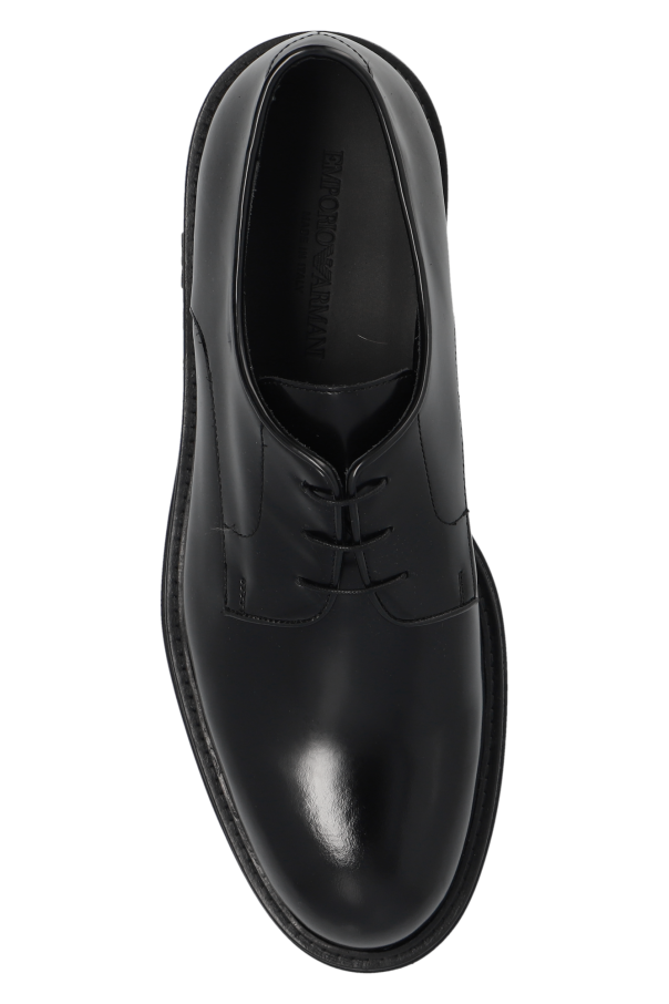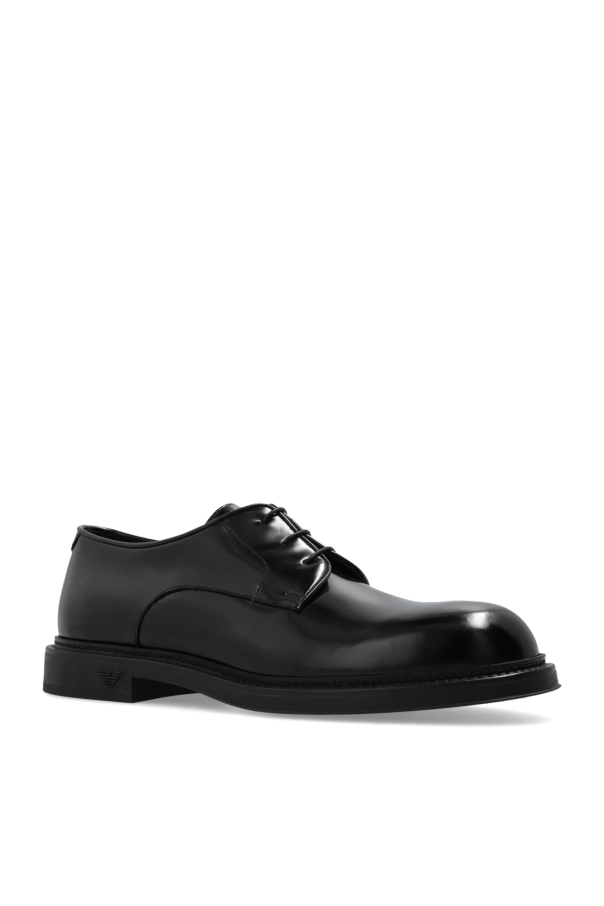 Black Derby shoes from Emporio Armani. Made from patent calf leather, this lace-up model sits on a black rubber sole and showcases a tactile logo on the side.