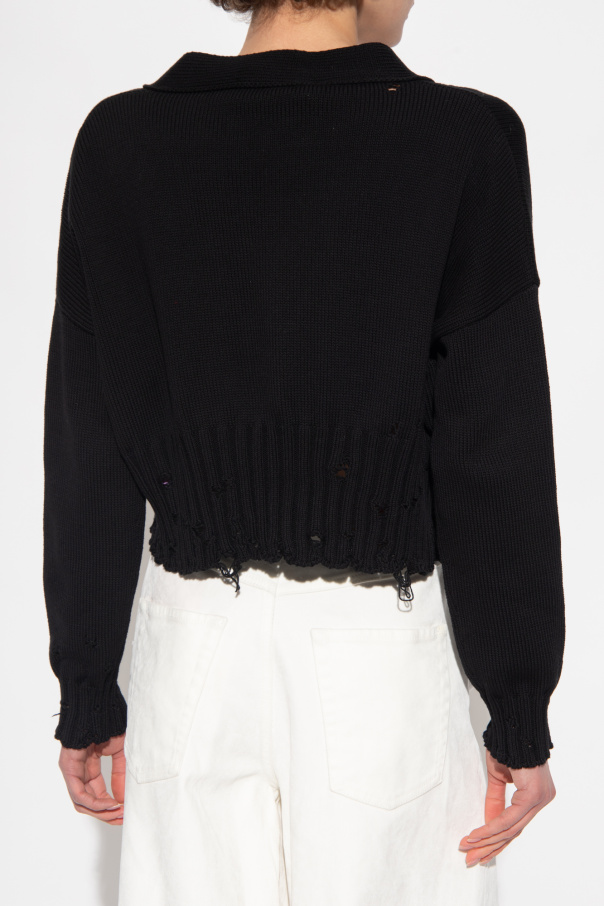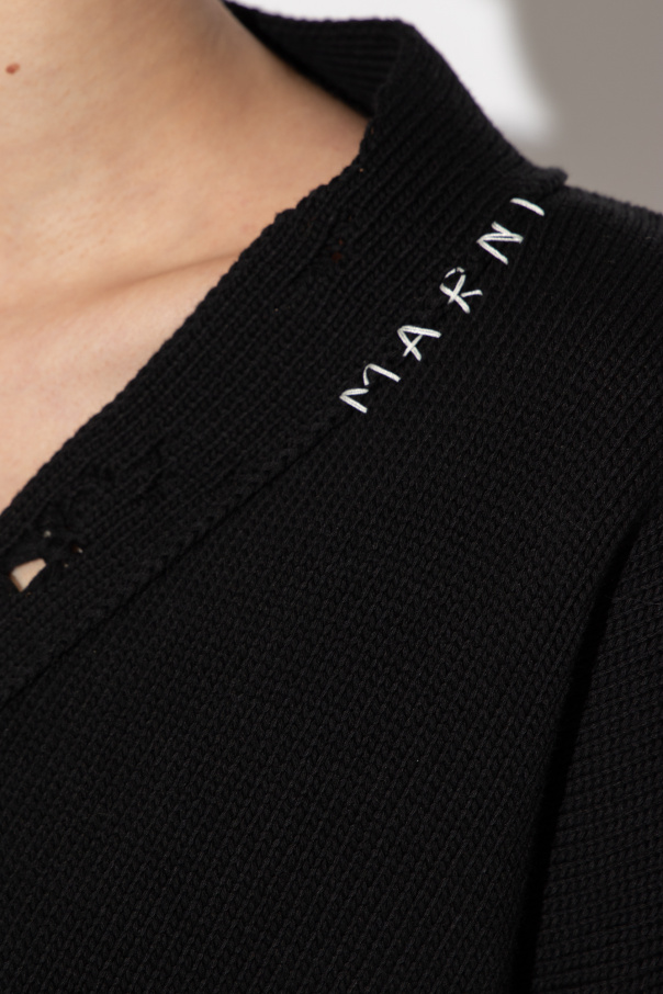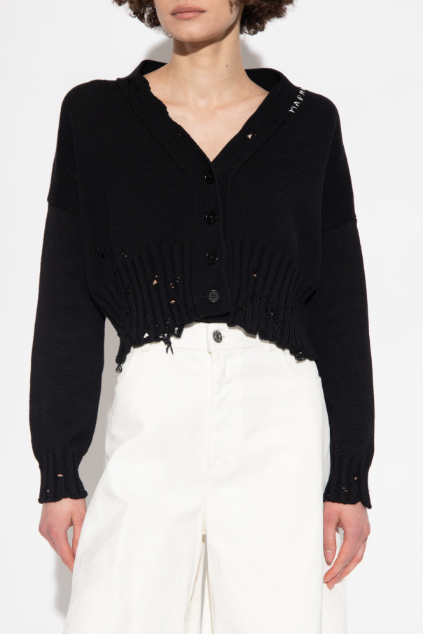 Black cardigan from Marni. Crafted from cotton with a cropped fit, this style fastens with buttons and features a V-neckline, white logo embroidery, distressed detailing and ribbing on the bottom hem and long sleeves.