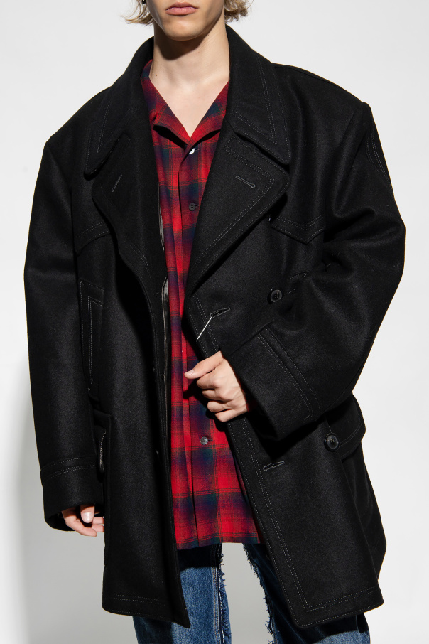 Black coat from Maison Margiela. Crafted with a double-breasted silhouette, this style features a white logo at the back, button fastenings, notch lapels, two slip pockets, two flapped pockets and long sleeves.