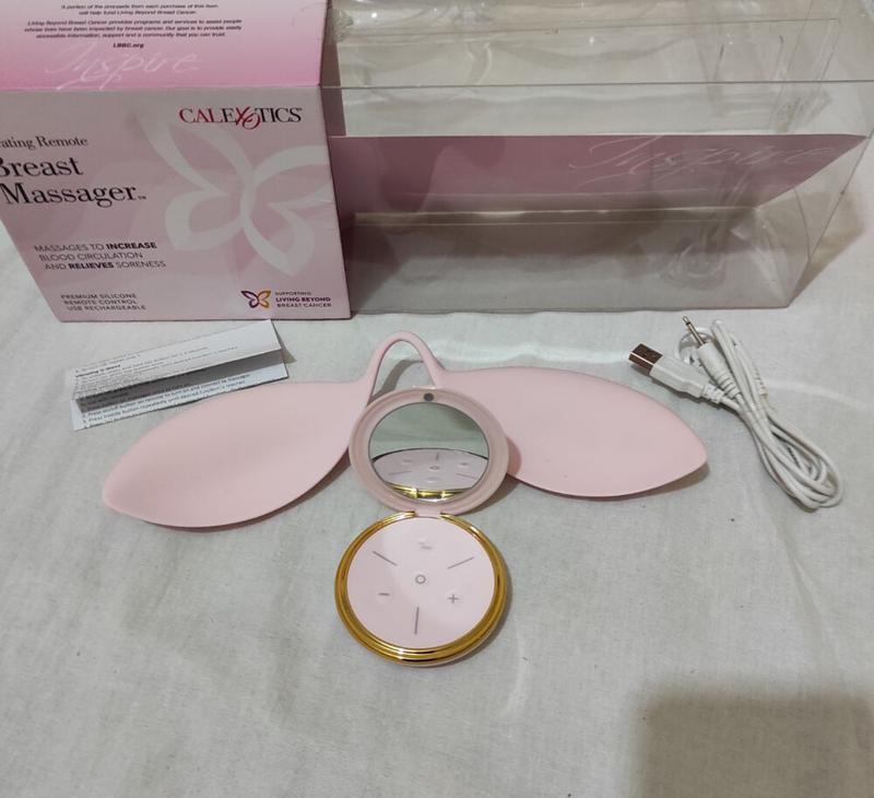 Вібраційний дистанційний масажер для грудей Inspire від California Exotic — це перезарядна через USB-порт жіноча секс-іграшка для стимуляції грудей із бездротовим дистанційним керуванням, яка приносить задоволення грудей і сосок, допомагає покращити кровообіг і приплив крові до зони грудей, а також знімає болючість грудей. Масажер для грудей Inspire обладнаний 2 потужними моторами, які пропонують 10 режимів вібрації, а також п'ять незалежних швидкостей, даруючи вам чуттєві відчуття парення й інтенсивну стимуляцію грудей і сосків. Цей надгладкий силіконовий водонепроникний вібраційний дистанційний масажер для грудей Inspire має форму, що дає змогу непомітно розмістити його всередині бюстгальтера. Цей масажер також можна використовувати з бездротовим компактним пультом дистанційного керування у формі дзеркала або без нього.