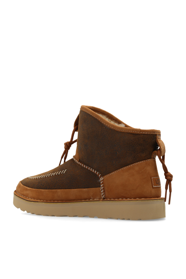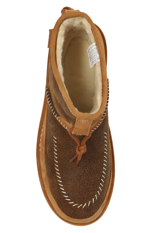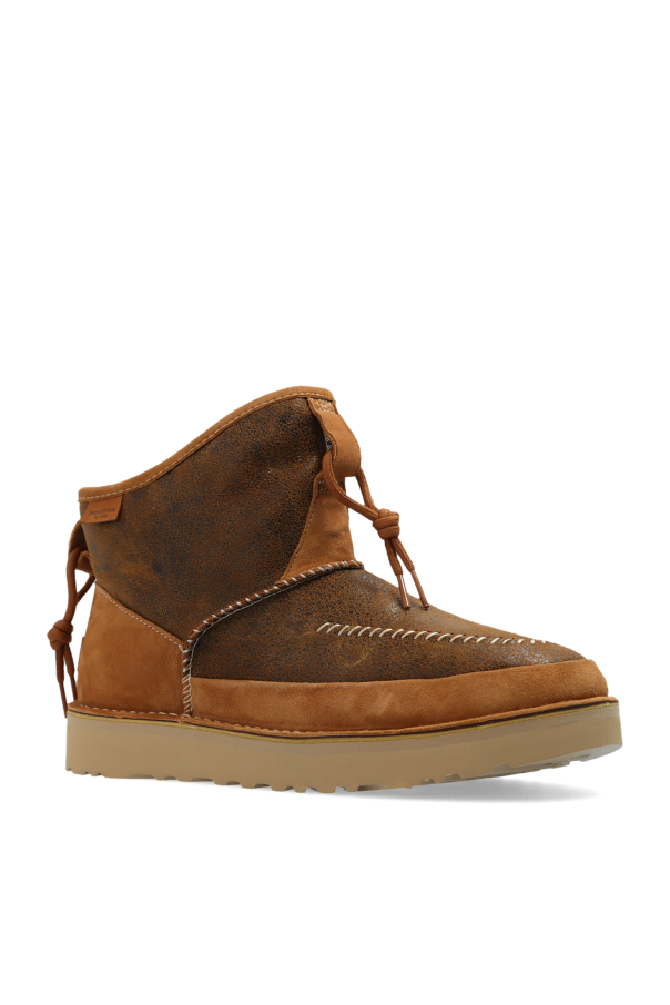 Brown ‘Campfire Crafted Regenerate’ snow boots from UGG. Made from leather with a cracked effect, this model showcases a logo-embossed patch. It contains 'Land-To-Market Verified' fibres, which come from regenerative agriculture. This type of farming means farmers are in tune with the rhythms of nature, allowing for more rest and regrowth, resulting in better food for farm animals and healthier soil. The 'UGGplush' inner insulation is made from a combination of high-quality wool and fine lyocell fibre. It is complete with a round toe with slight padding, a pull tab on the back and a beige ‘SugarSole™’ rubber sole.